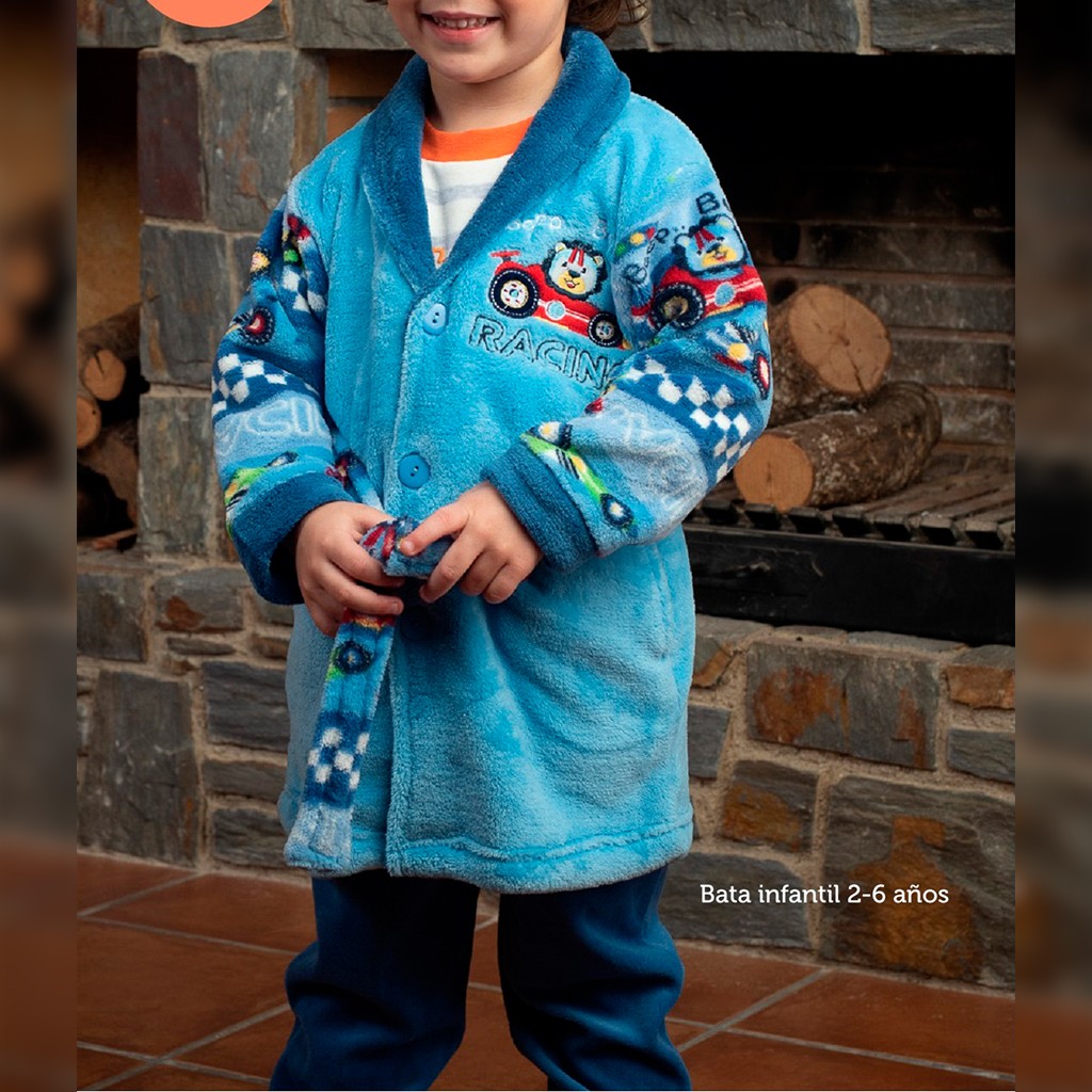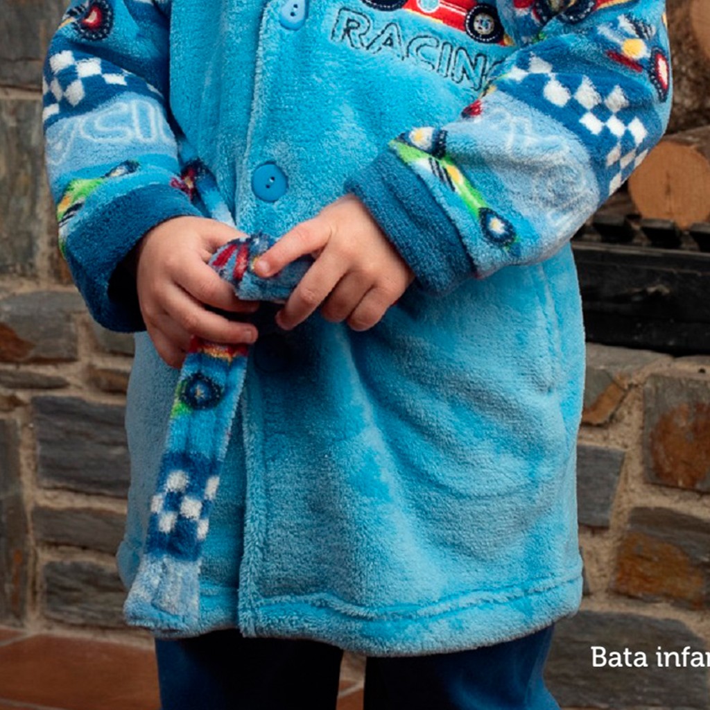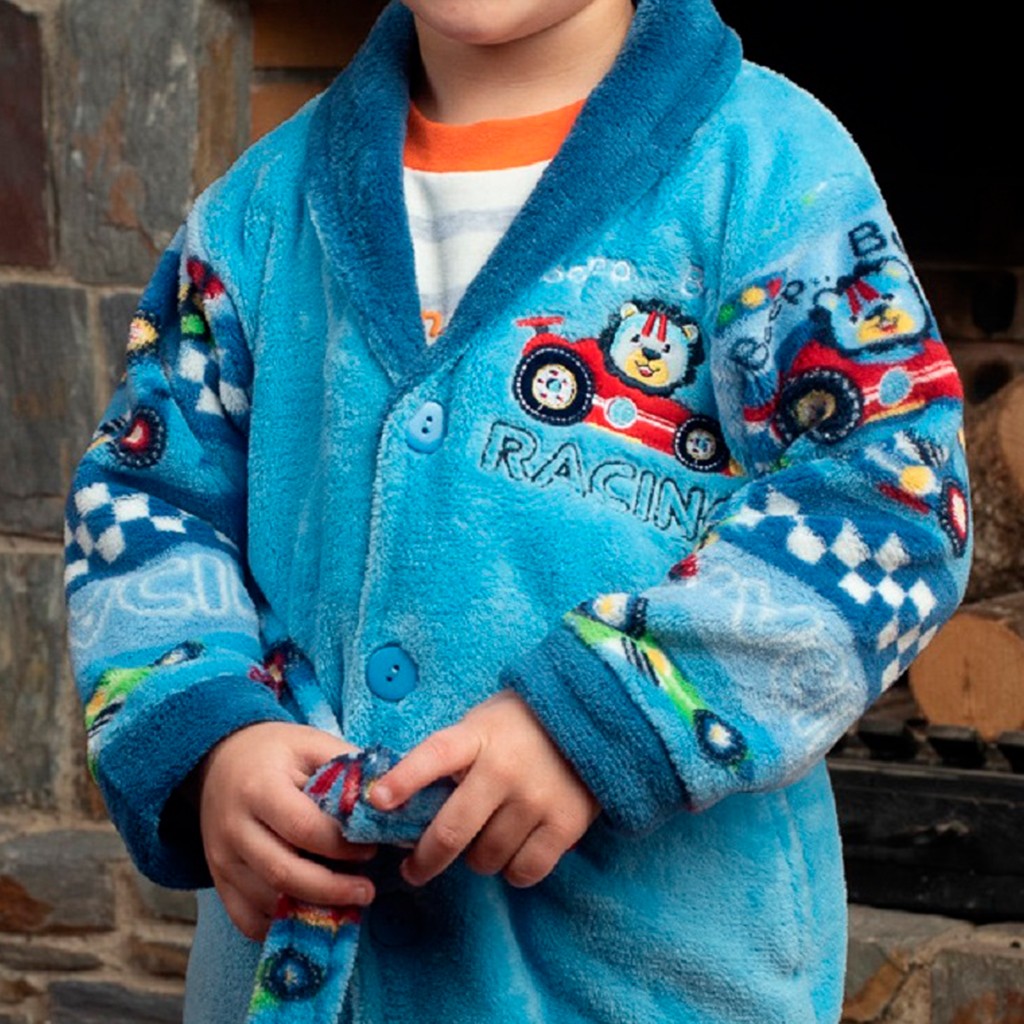 Suave y cálida bata de niño en tejido de coralina, con detalles bordados. Mangas y cinturón estampado con divertido dibujo. Abrocha por botones y cinturón.