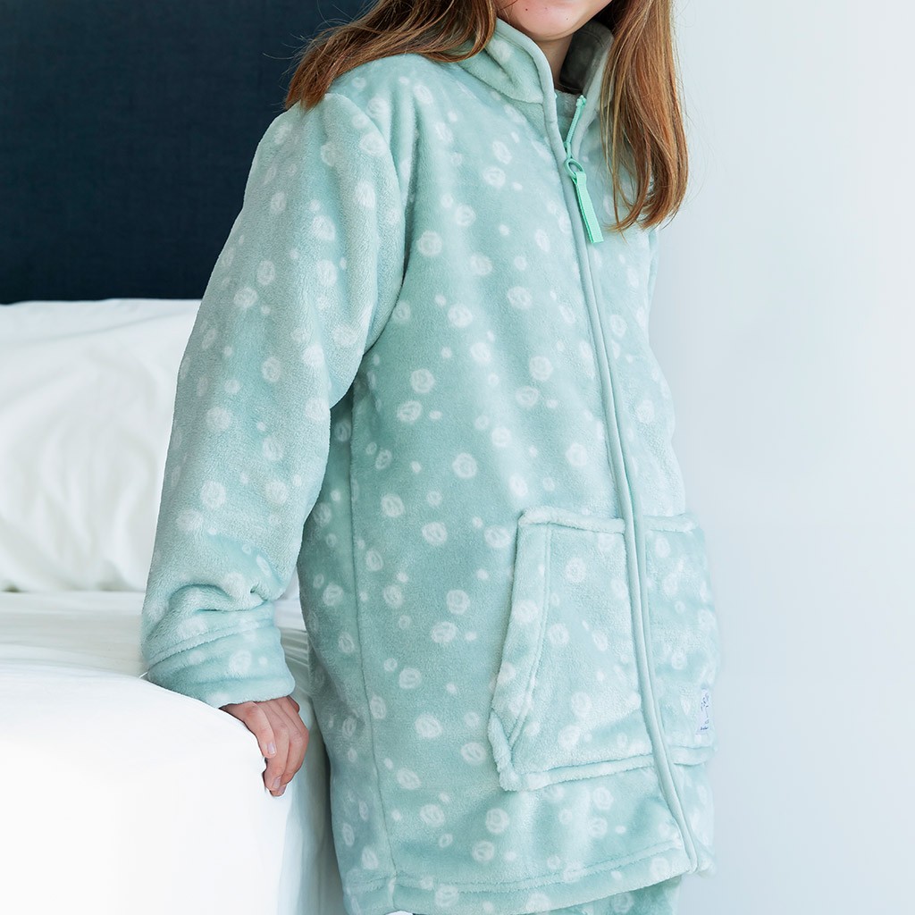 Bata de niña estampada con abertura de cremallera y cuello alto, confeccionada en cálido tejido de coralina con bolsillos frontales. Presentado en caja.