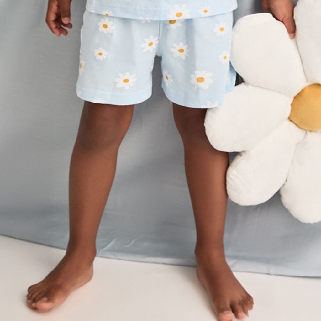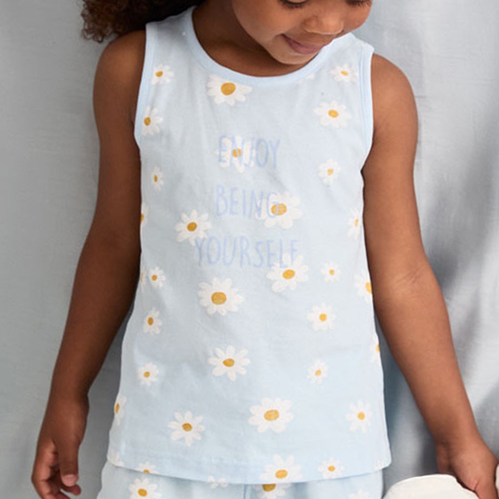Pijama de niña confeccionado en tejido de algodón con camiseta de tirantes y pantalón corto estampado con margaritas. Presentado en caja.