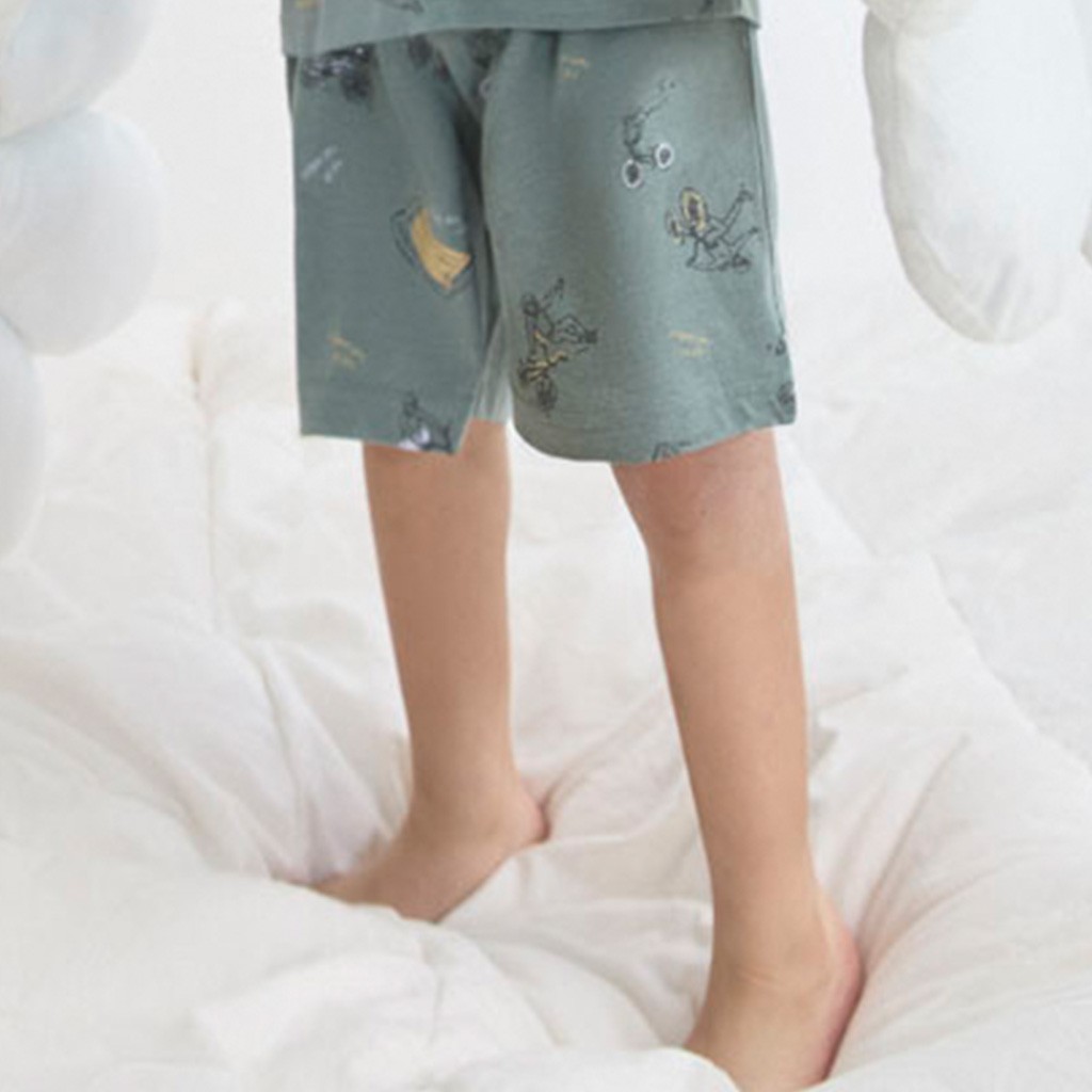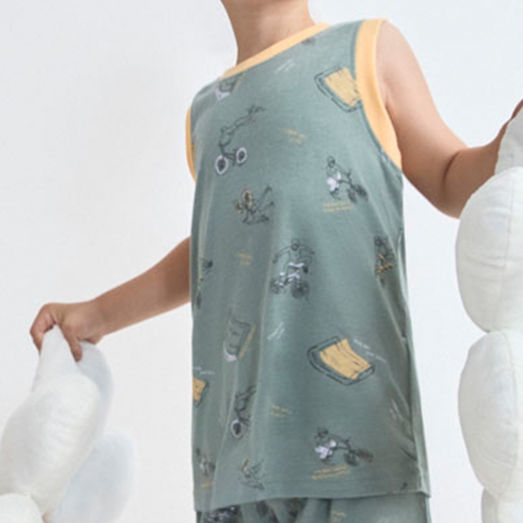 Pijama de niño en tejido de algodón estampado compuesto por camiseta sin mangas y pantalón corto.