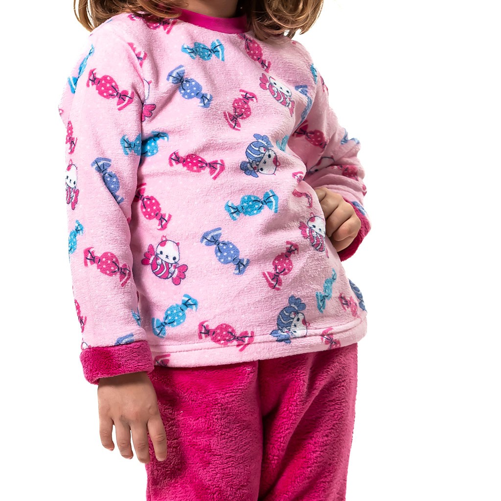 Pijama infantil en tejido de suave coralina con camiseta estampada y pantalón a contraste en color fucsia, de la marca Kinanit. Presentado en caja.