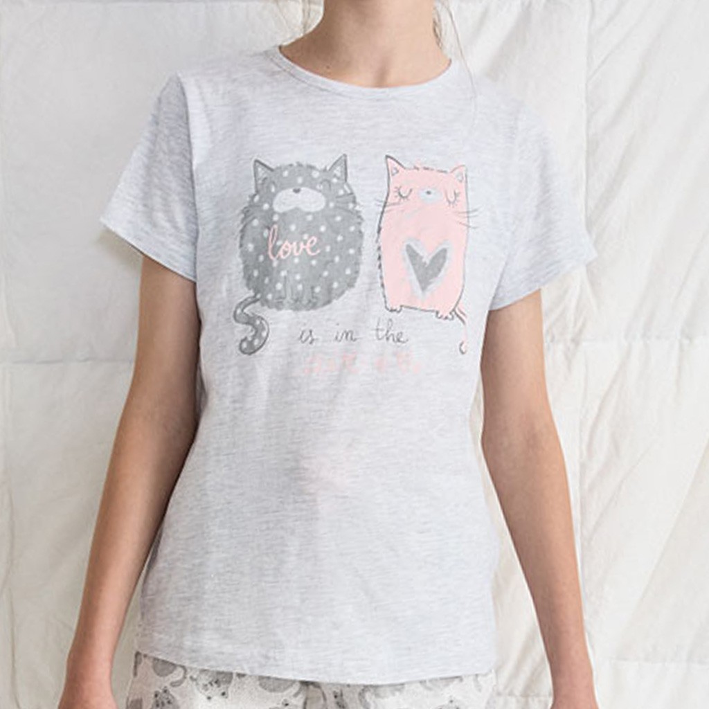 Pijama juvenil de tejido de algodón con camiseta de manga corta y pantalón estampado con gatitos. Presentado en caja.