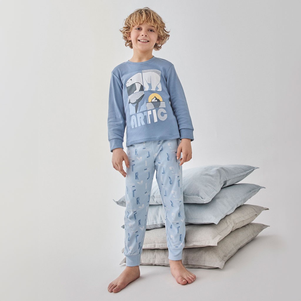 Pijama infantil para niño de manga larga con camiseta estampada de estilo polar y pantalón a juego con puños. Confeccionado en tejido algodón suave ideal para el invierno. Se envía en caja