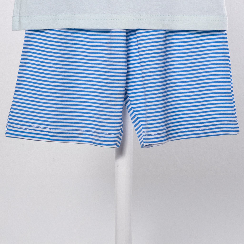 Pijama de niño compuesto por camiseta de manga corta con dibujo delantero y pantalón corto a rayas, en tejido de algodón. Presentado en cajita.