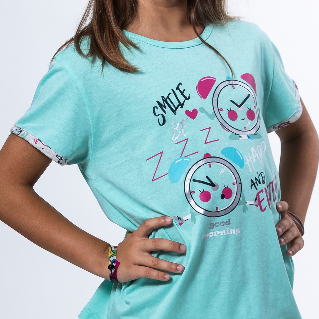 Pijama de niña de algodón con camiseta de manga corta y pantalón estampado con detalles de relojes despertador.
