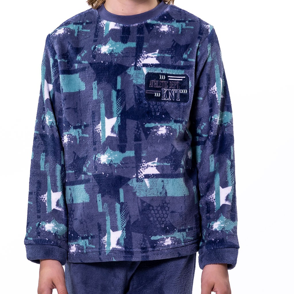 Pijama para niño cadete de la marca Kinanit, confeccionado en suave tejido de coralina, con sudadera estampada y pantalón a juego. Presentado en caja.