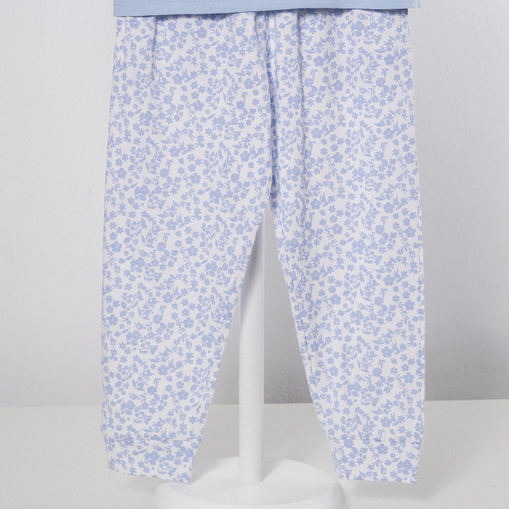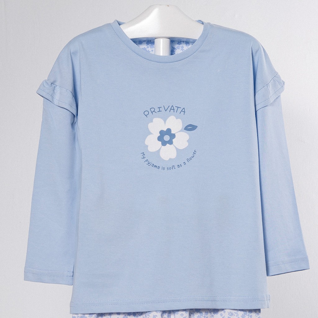Pijama infantil en tejido de algodón de entretiempo con camiseta de manga larga con volante en hombrera, pantalón largo con estampado a juego. Presentado en caja.