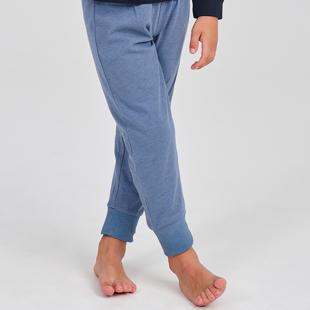 Pijama para niño confeccionado en tejido algodón de entretiempo con camiseta de manga larga con dibujo y terminación en puño, pantalón largo liso a contraste. Presentado en caja.