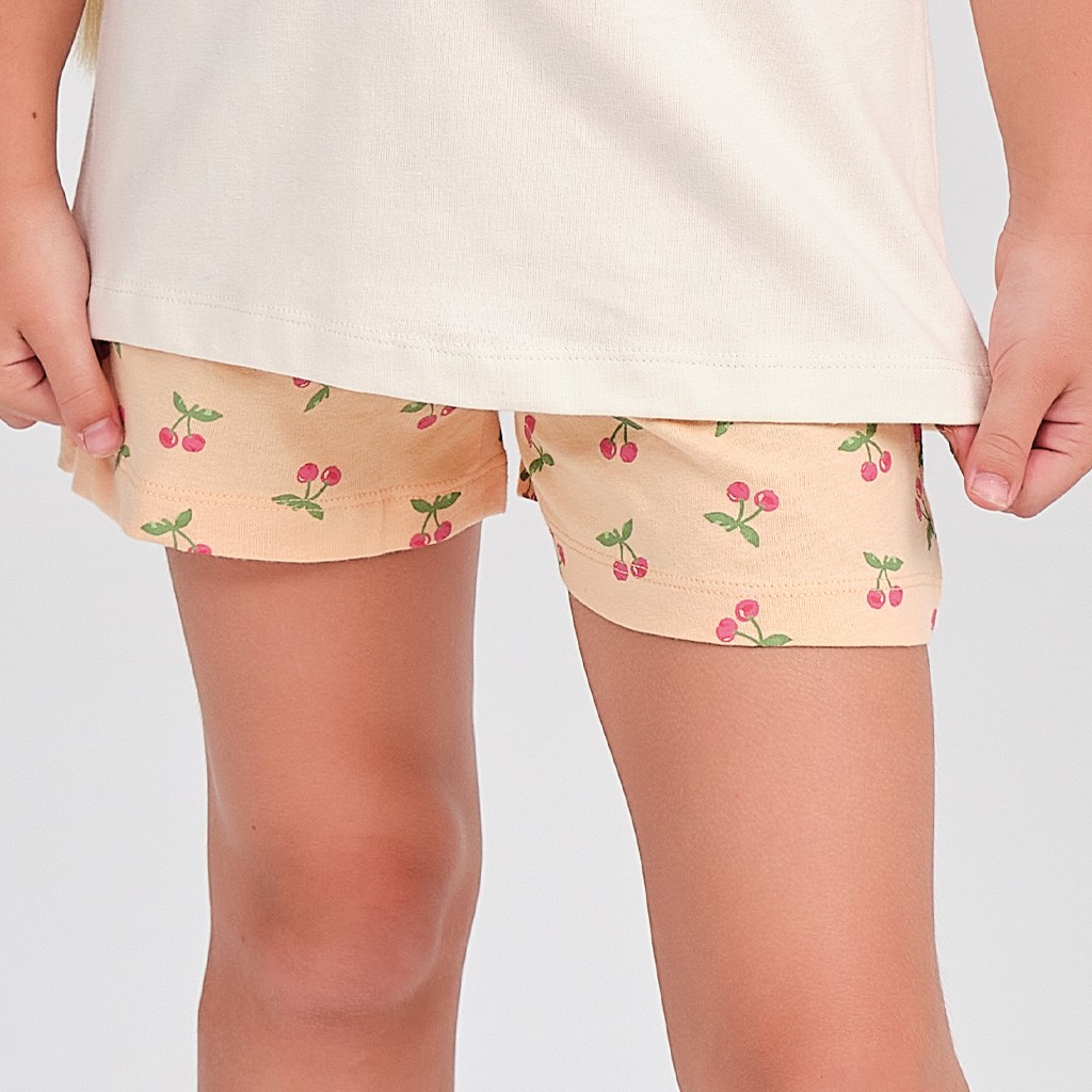 Pijama de niña en tejido de algodón compuesto por camiseta de manga corta y pantalón corto estampado con con cerezas. Se envía en caja.