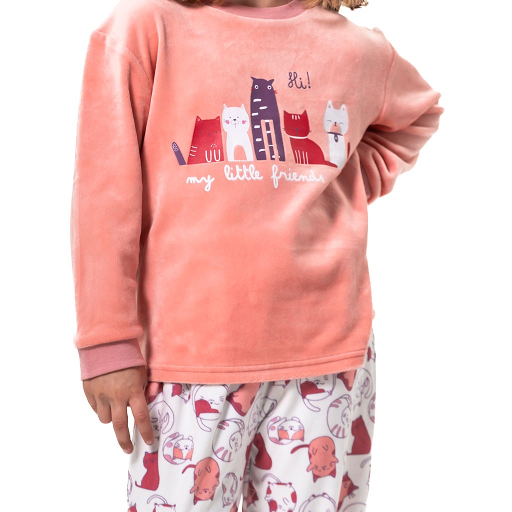 Pijama de niña confeccionado en suave tejido spandex rosa con dibujo de gatitos, combina camiseta de manga larga y pantalón estampado. Presentado en caja. De la marca Kinanit.