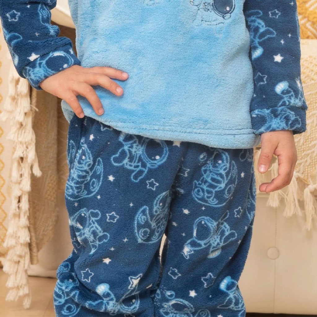 Pijama de niño estampado de la marca Kinanit, confeccionado en cálida y suave coralina en tonos azules. Presentado en caja.