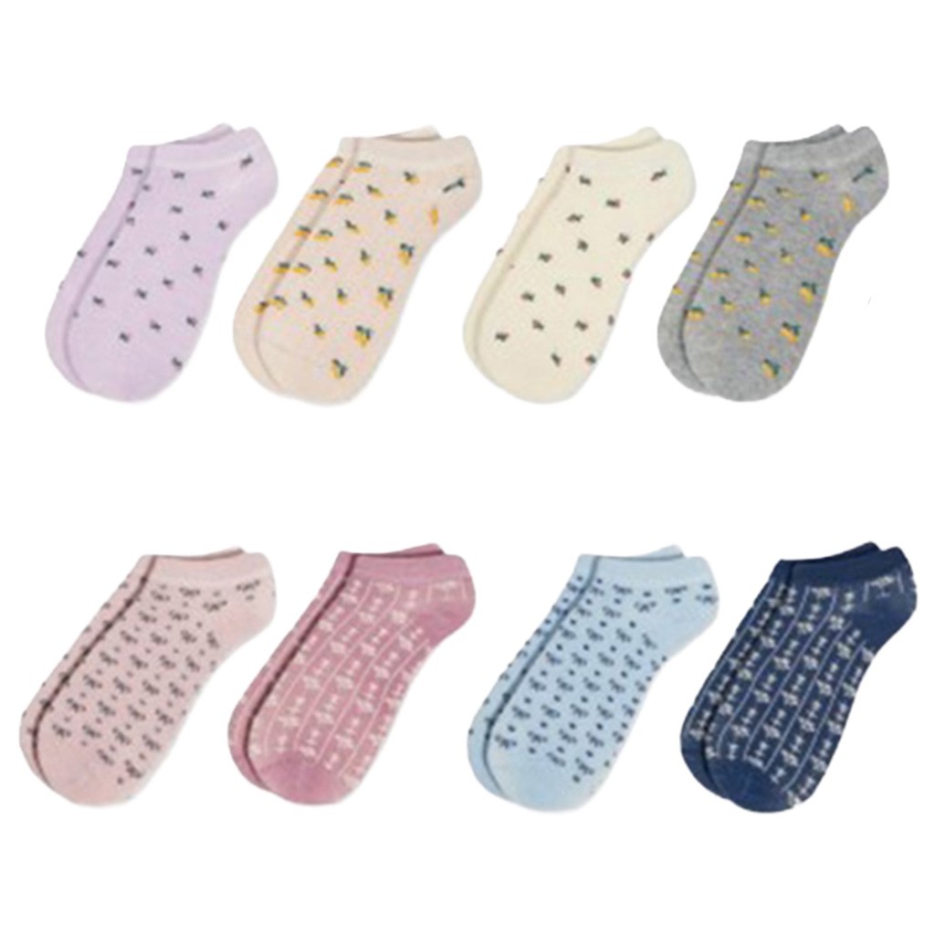 Expositor de sobremesa con 18 pares de calcetines invisibles de mujer en tejido de tacto suave modal con estampados variados.