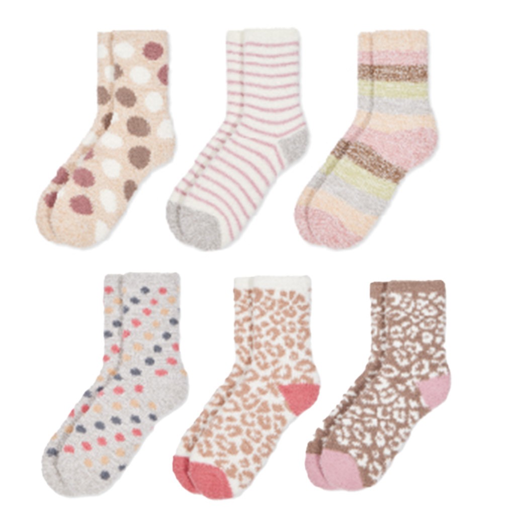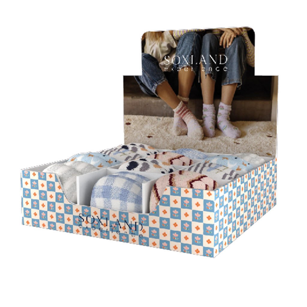 Expositor de sobremesa con 12 pares de calcetines de suave tejido de coralina con suela antideslizante. Incluye 6 modelos diferentes.
