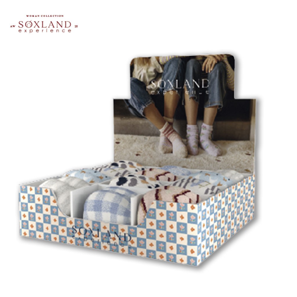 Expositor de sobremesa con 12 pares de calcetines de fantasia térmicos con puño sensitive. Cada expositor incluye 8 diseños diferentes de varios colores.
