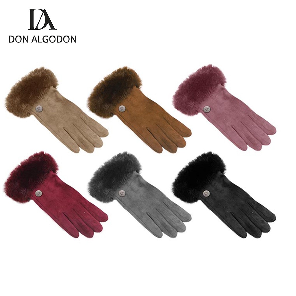 Guantes de mujer de aspecto de piel vuelta rematados con suave y calido pelito y forro interior. Se envian en bolsas de 6 surtidos junto con una bolsa ideal para regalo con el logo de la marca "Don Algodón".