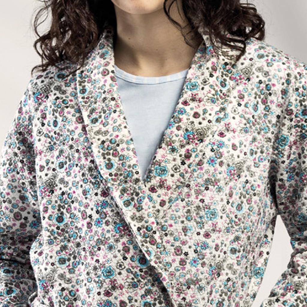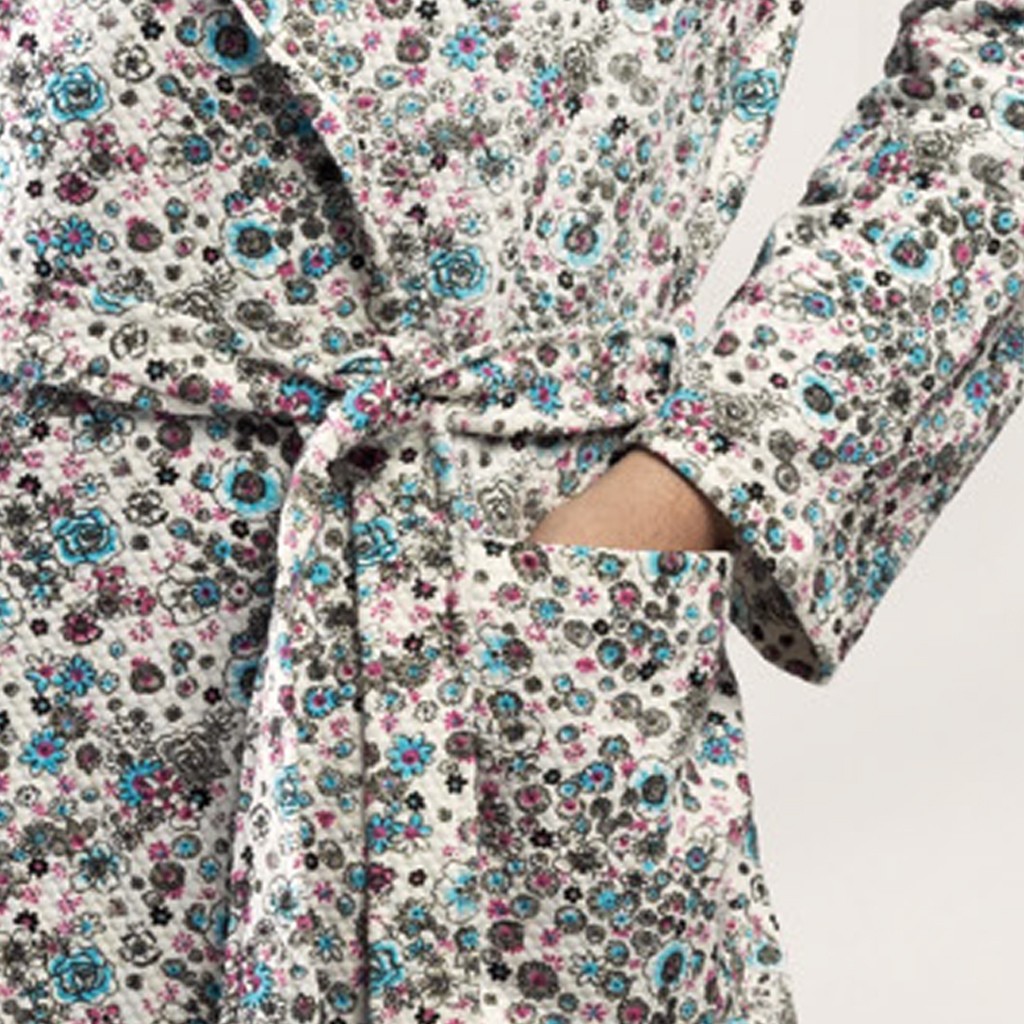 Bata Cruzada y abrochada con cinturon , de manga larga y confeccioanda en cálido pique de invierno estampado con florecillas.