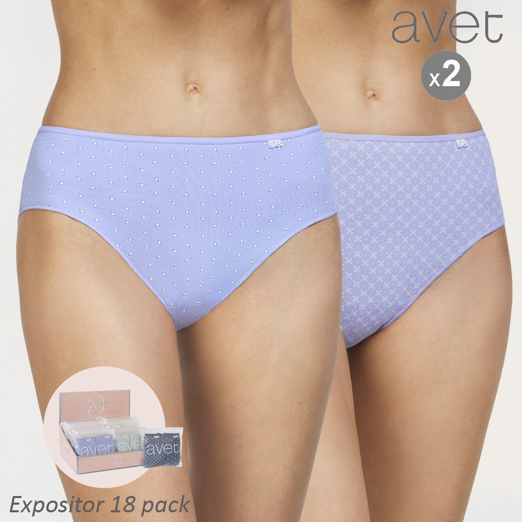 Exposictor de 18 pack 2 bragas altas de algodón peinado, estampadas y surtidas en color verde, marino y malva. Fabricado en España.