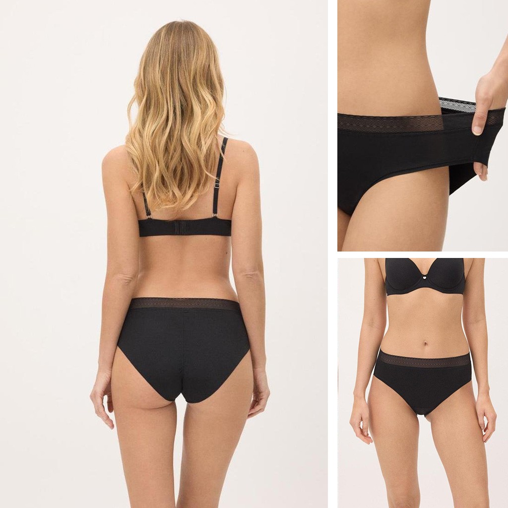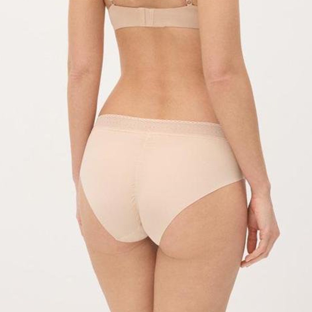 Braga de corte alto para mujer, sin costuras confeccionada en tejido adaptable con puente de rizo y cinturilla de encaje elástico.