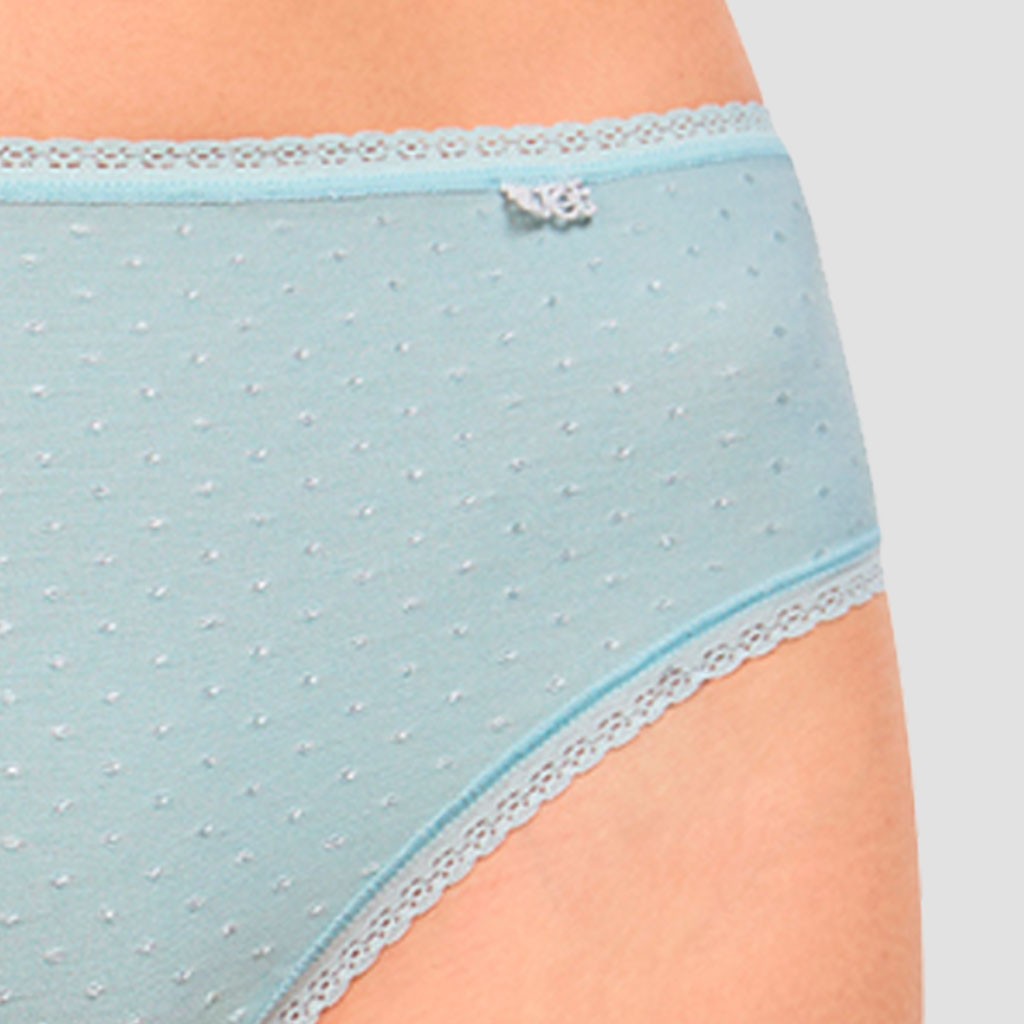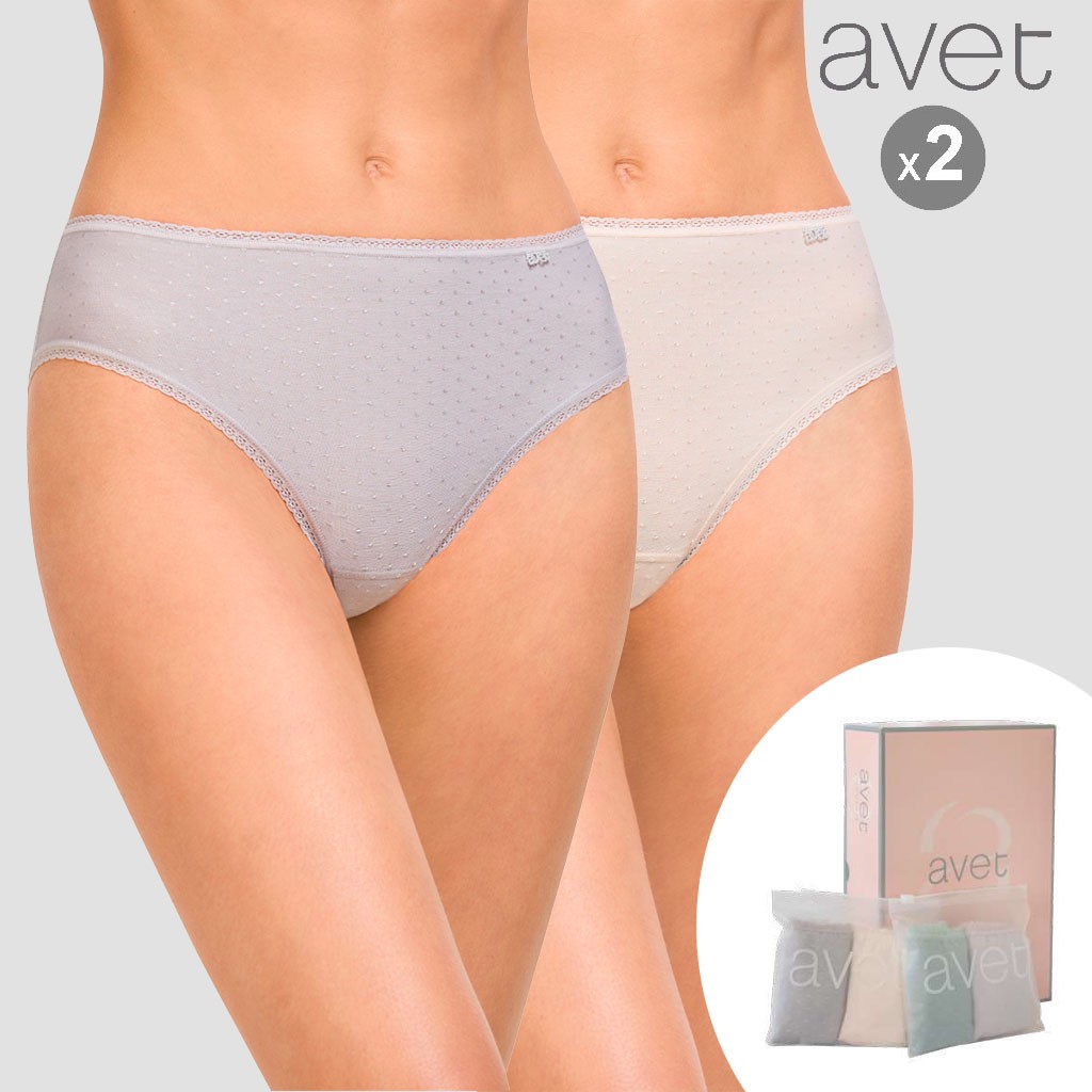 Pack de 2 bragas de mujer en tejido fino y suave de algodón poliamida elástica con diseño de topitos bordados rematadas con fina puntilla y logo avet en cintura. se envia en cajas de 6 blister surtidos de color.