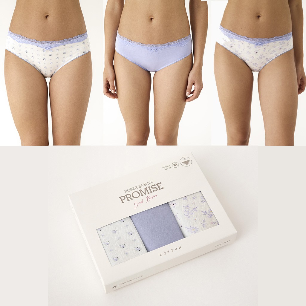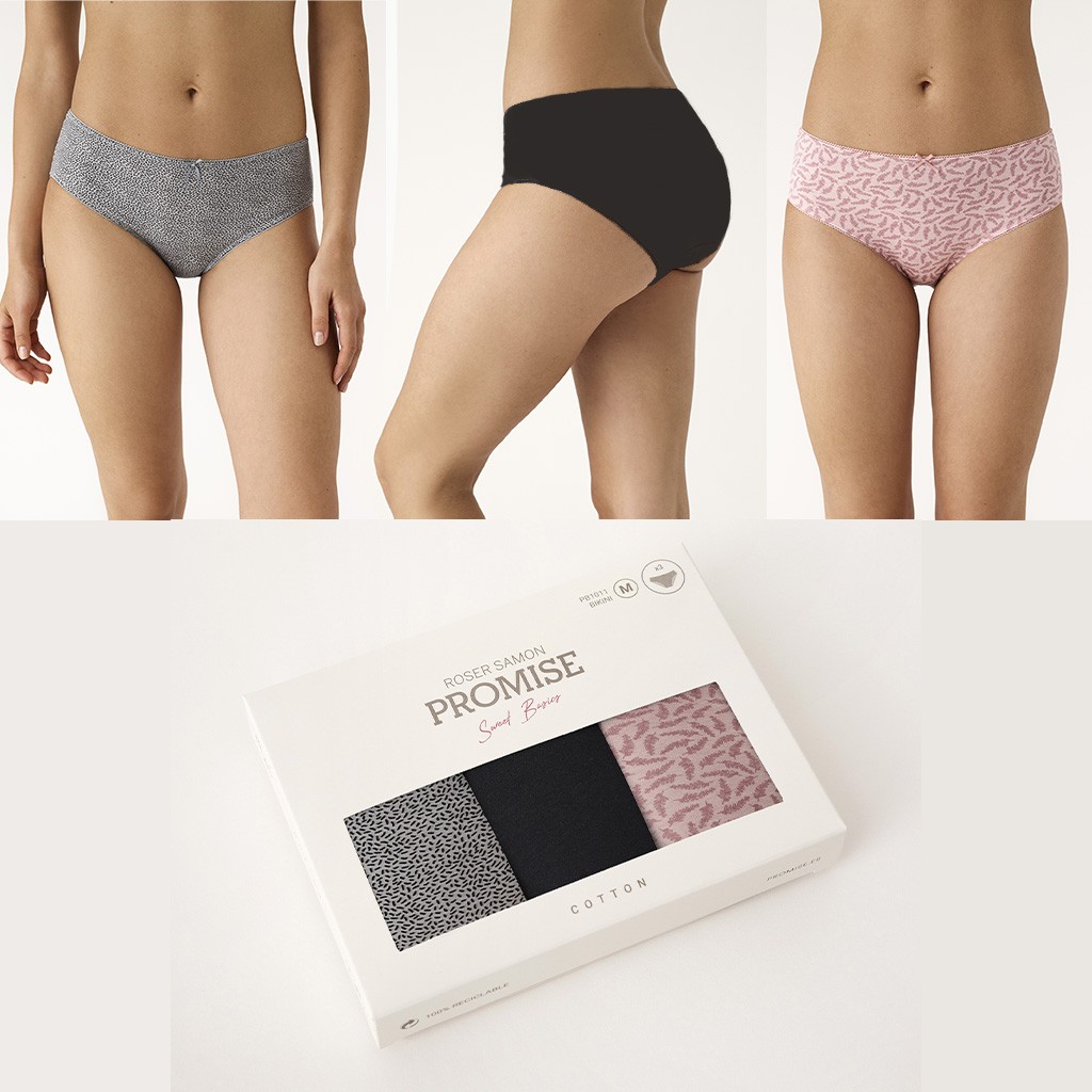 Expositor de 12 pack de 3 bragas midi de algodón elástico en 3 diferentes combinaciones con forro interior de algodón 100%. Cada expositor contiene 12 pack surtidosen esta proporcion: 3 de la talla M, 6 de la talla L y 3 de la talla XL.