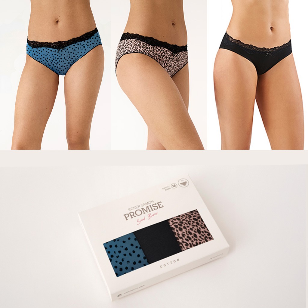 Expositor de 12 pack de 3 bragas midi de algodón elástico en 3 diferentes combinaciones con forro interior de algodón 100%. Cada expositor contiene 12 pack surtidosen esta proporcion: 3 de la talla M, 6 de la talla L y 3 de la talla XL.