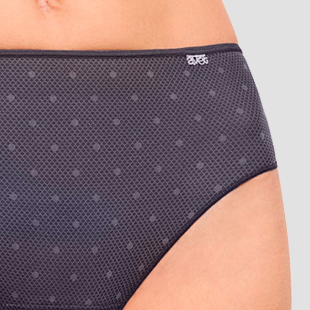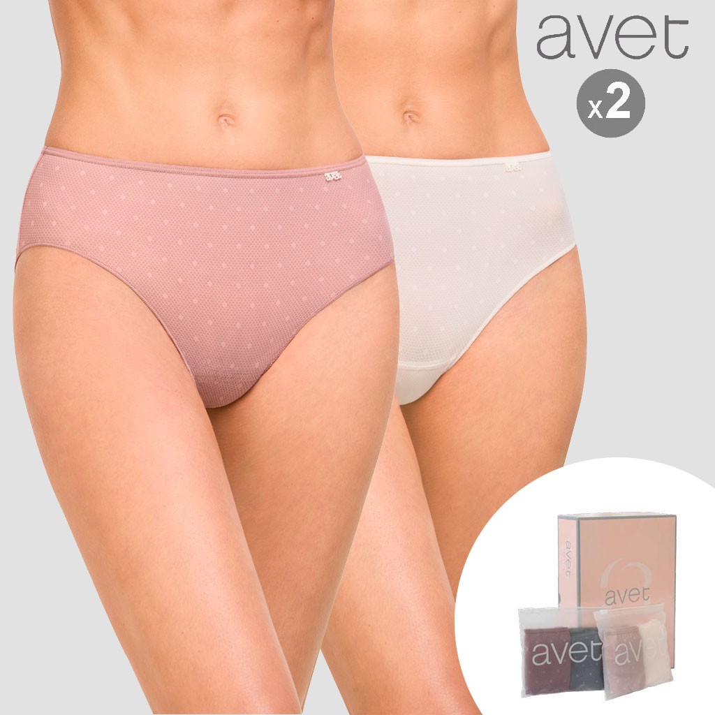 Pack de 2 bragas de mujer de suave poliamida elástica con diseño topitos sobre redecilla simulada y logotipo avet en la cintura. Se envia cajas de 6 blister de 2 unidades surtidas en colores.