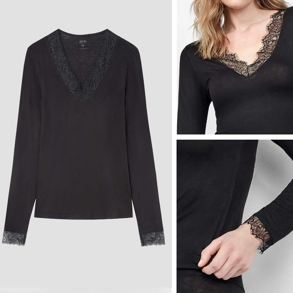 Camiseta de mujer manga larga de la nueva linea termal de gisela confeccionada con un 12% de lana mas viscosa y elastano con propiedades térmicas sin renunciar a la comodidad ya que es fina y ligera. Rematada con puntilla en cuello pico y puño
