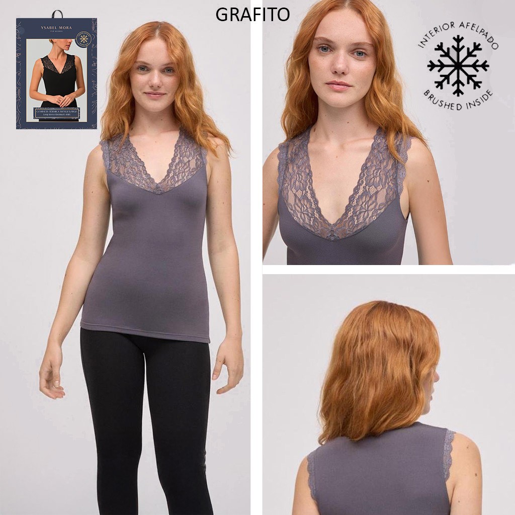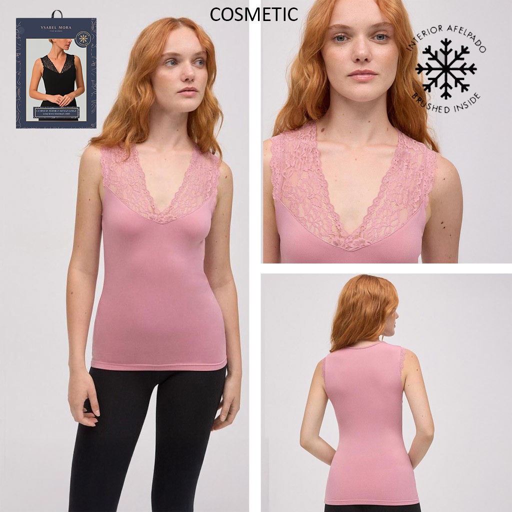 Camiseta de mujer termica en tejido polar cálido y suave. Patrón sin mangas con pecho de encaje y acabado en cuello pico. Elegante diseño que se puede usar tanto de interior como de exterior.