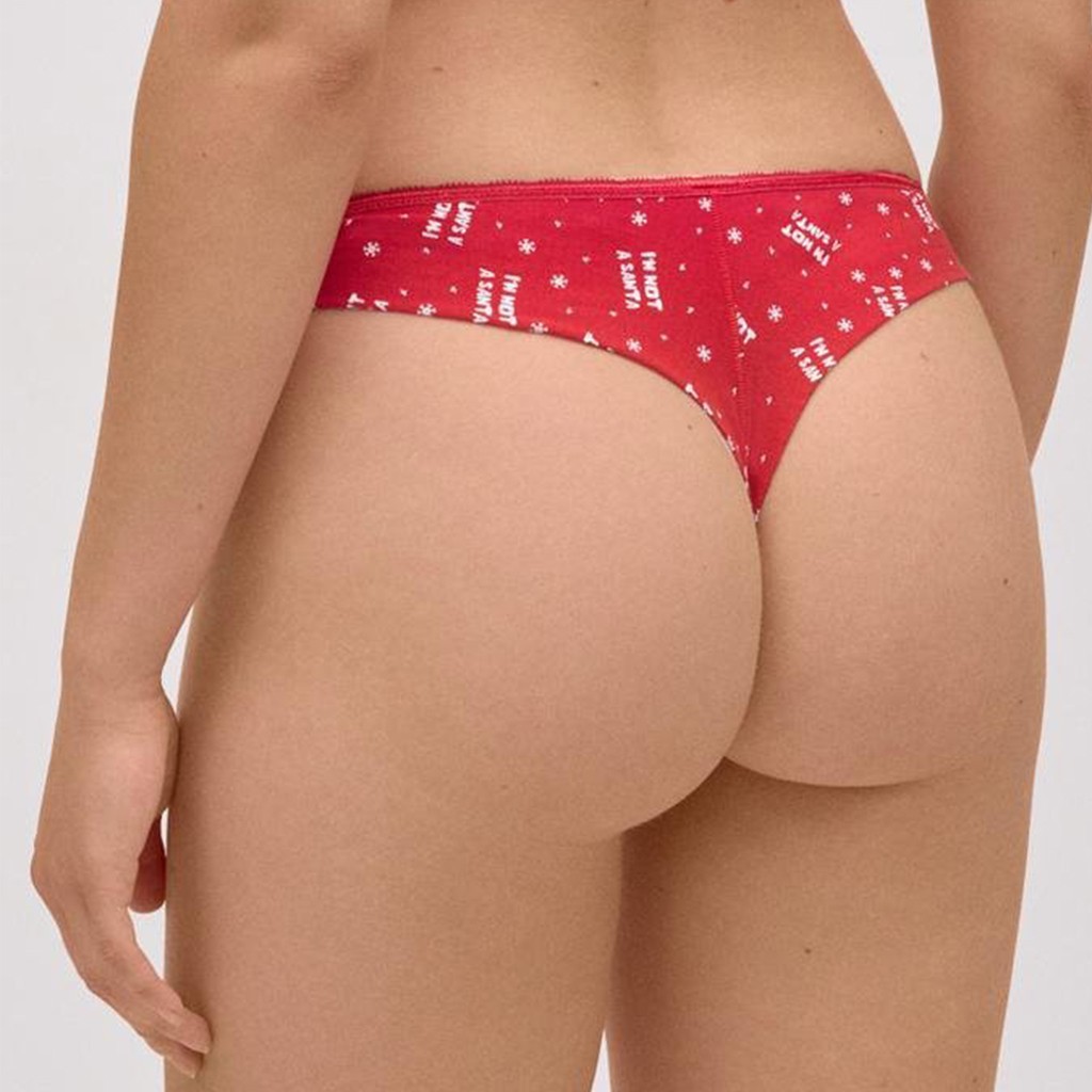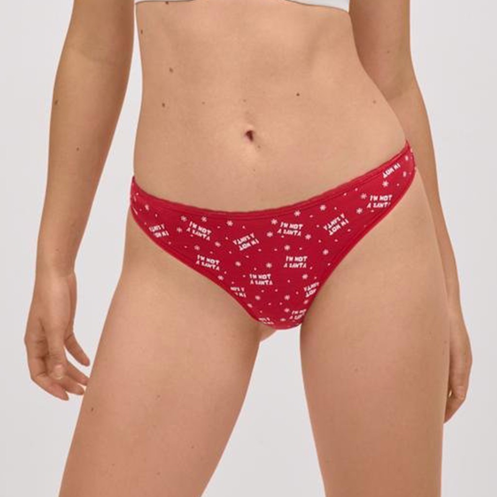 Tanga de mujer en tejido de algodón con divertido estanado navideño con frase "I´m not a Santa". Se envia en cajita de regalo en forma de casita y con lazo. Ideal para recibir el año nuevo como se merece.