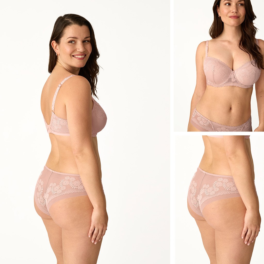 Conjunto para mujer que combina sujetador capacidad con ligero relleno y tirantes regulables con gancho para cruzar en la espalda y braga bikini, confeccionado en suave encaje.