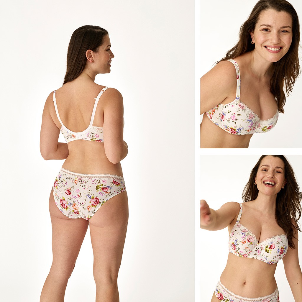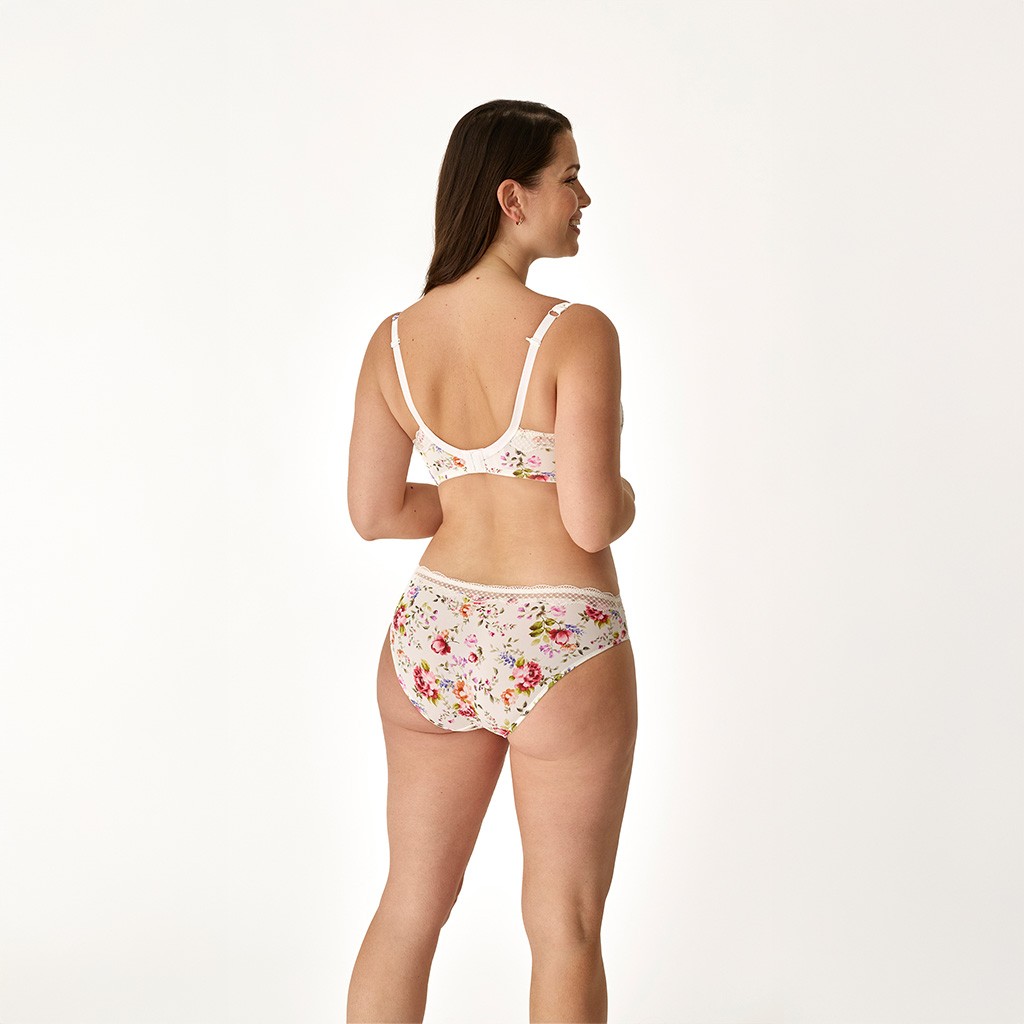 Conjunto de lencería para mujer compuesto de sujetador de capacidad con ligero relleno estampado y con tira de encaje en las copas y tirantes con gancho para cruzar, a juego con braga bikini.