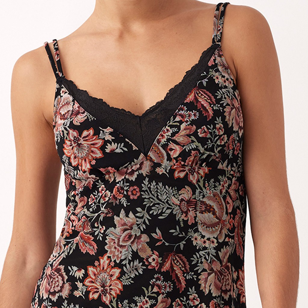 Camisón lencero en tul estampado, con delicado detalle de encaje en el escote y doble tirante para un ajuste ligero y femenino. Acabado suave y vaporoso, ideal para la noche. Presentado en elegante caja.