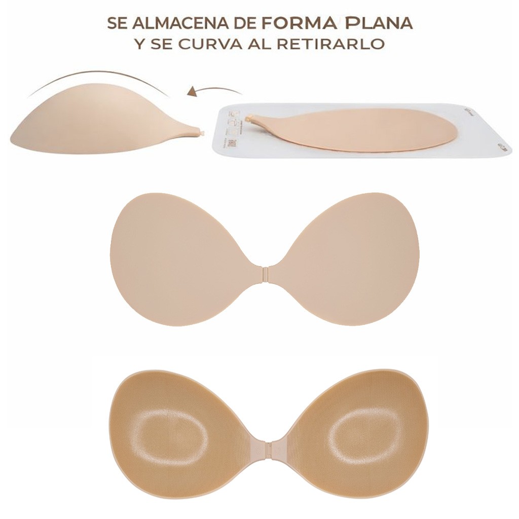 Nuevas copas adhesivas magic bra en formato extraplano para faciilitar el almacenaje. Una vez retirado de su tablero de almacenamiento recupera su forma moldeada. incluye un cubre pezones que se coloca en el interior y tapa el adhesivo.