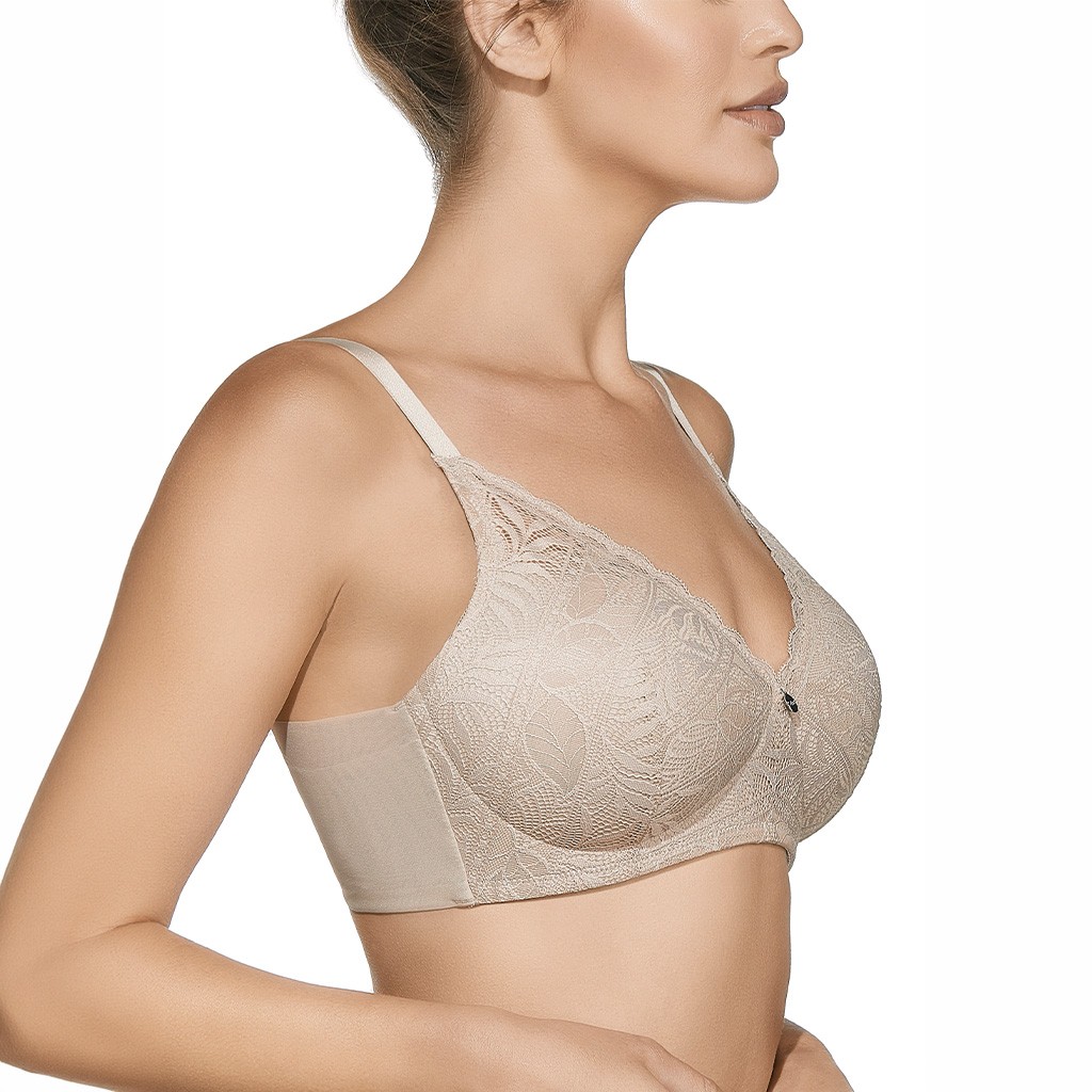 Sujetador copa C línea Primavera de Selene. Patron especial sin aro reforzado con foam bajo el pecho y con ligero relleno forrado de elegante encaje en copas y tejido de tul perforado en la espada, Combina con brasileña 3140, bikini 3139 y braga 3138