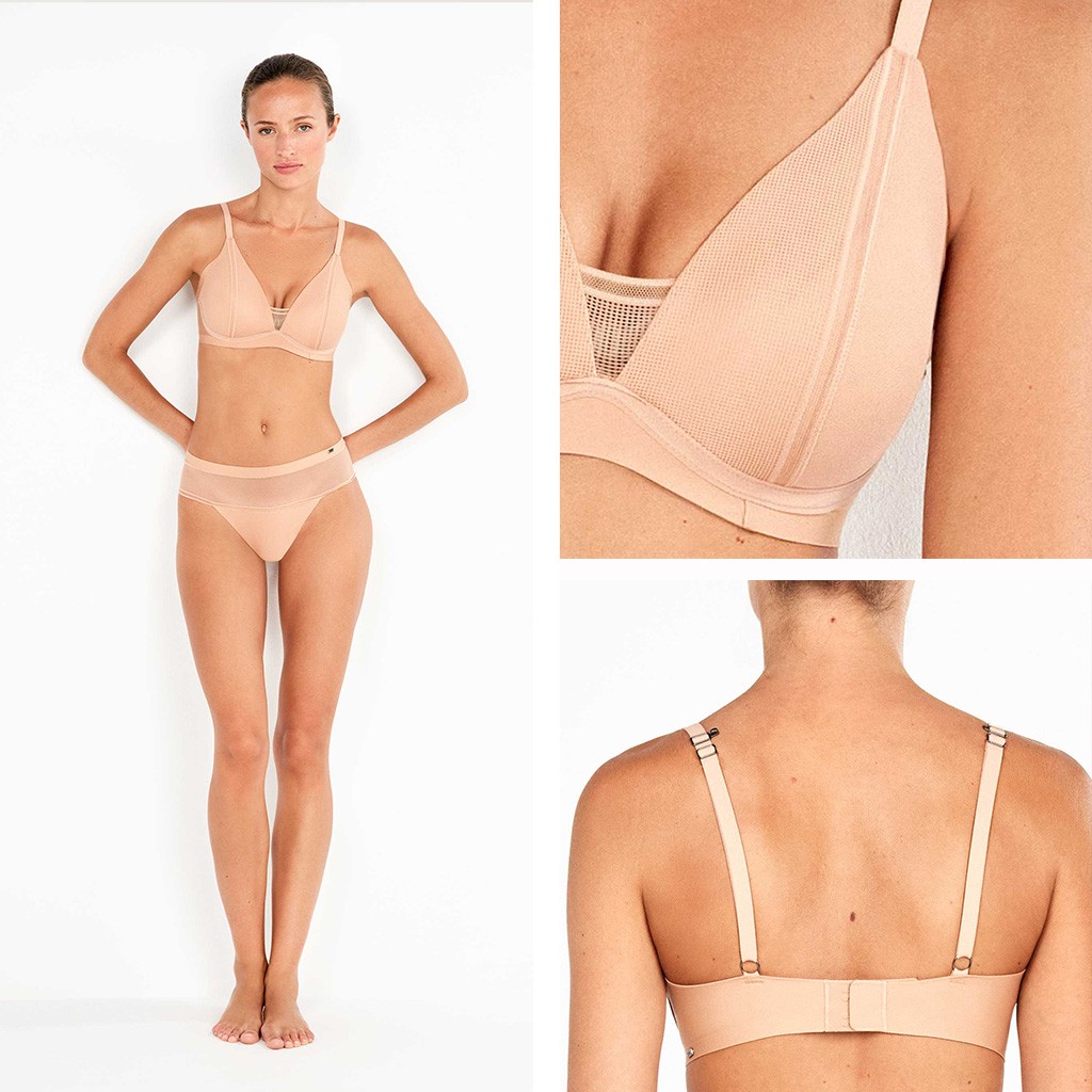 Sujetador sin aros de la línea Moments 12 Minim de Gisela. Escote en V y diseño alto en el lateral que suaviza las irregularidades del costado. Con tirantes regulables que pueden cruzarse. Acabados termofusionados que no marcan.