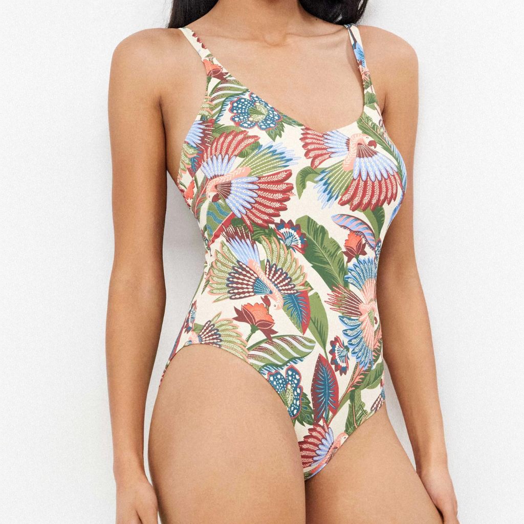 Traje de baño de una pieza para mujer en tejido estampado sin aros y con tirantes ajustables.