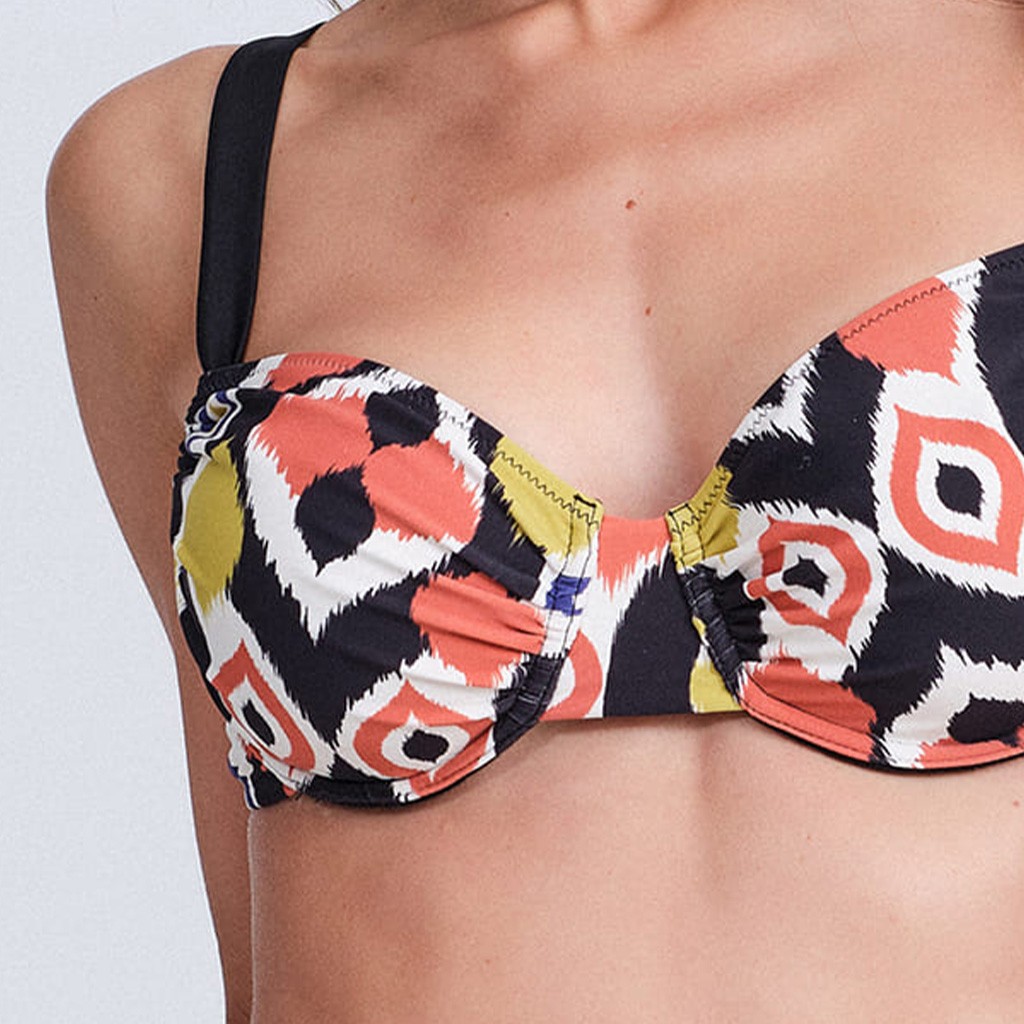 Conjunto de baño para mujer con sujetador estampado con aros en las copas fruncidas en el lateral para mayor ajuste y con forro interior, tirante ancho regulable y broche de cierre en click dorado. Combina con braga alta efecto control con tejido