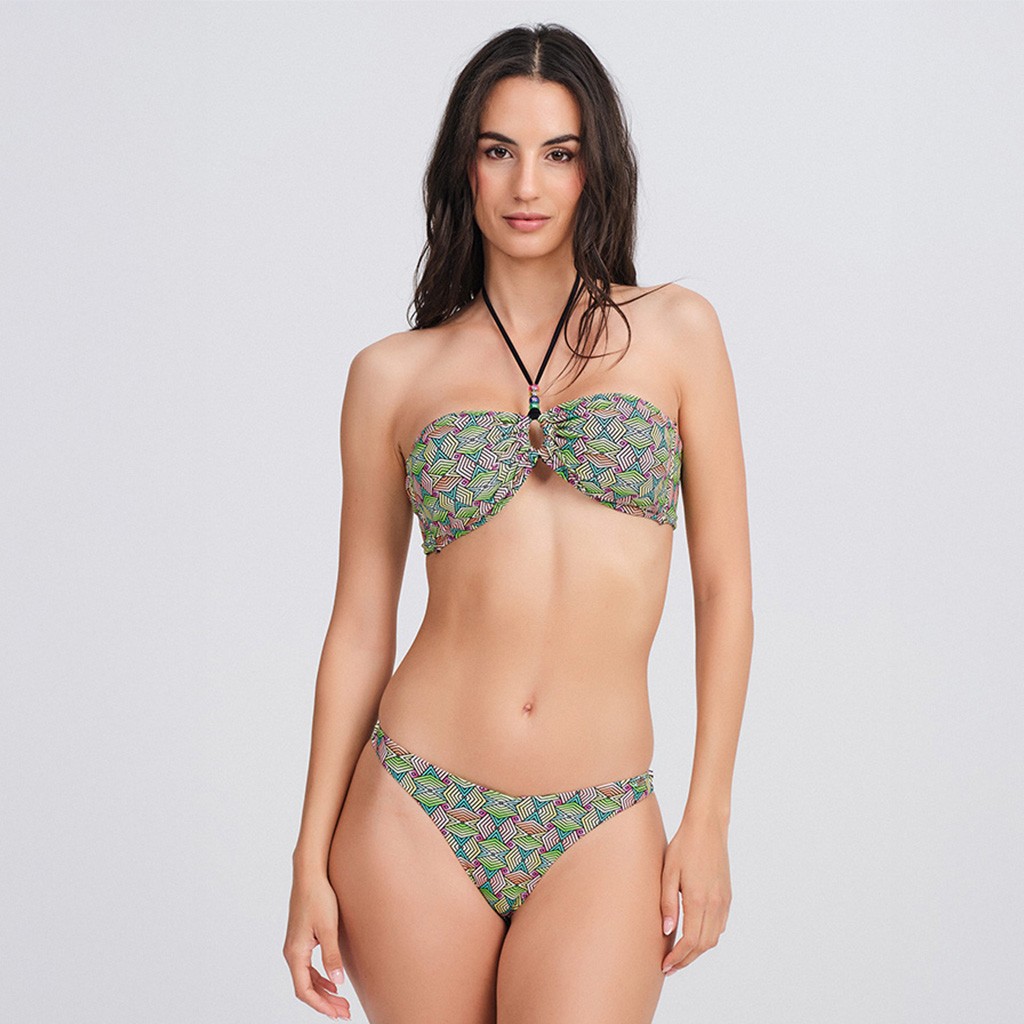 Conjunto para baño de mujer con sujetador bandeau con ligero relleno extraible en las copas para realzar, cierre de lazada en la espalda y cordón al cuello en tejido suave con estampado colorido que combina con braga brasileña con un diseño de ajuste