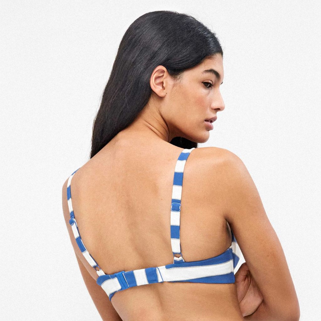 Sujetador de baño para mujer con aro y relleno, abrochado en espalda y con tirantes regulables, diseño de rayas con delantero cruzado, braga disponible a juego.