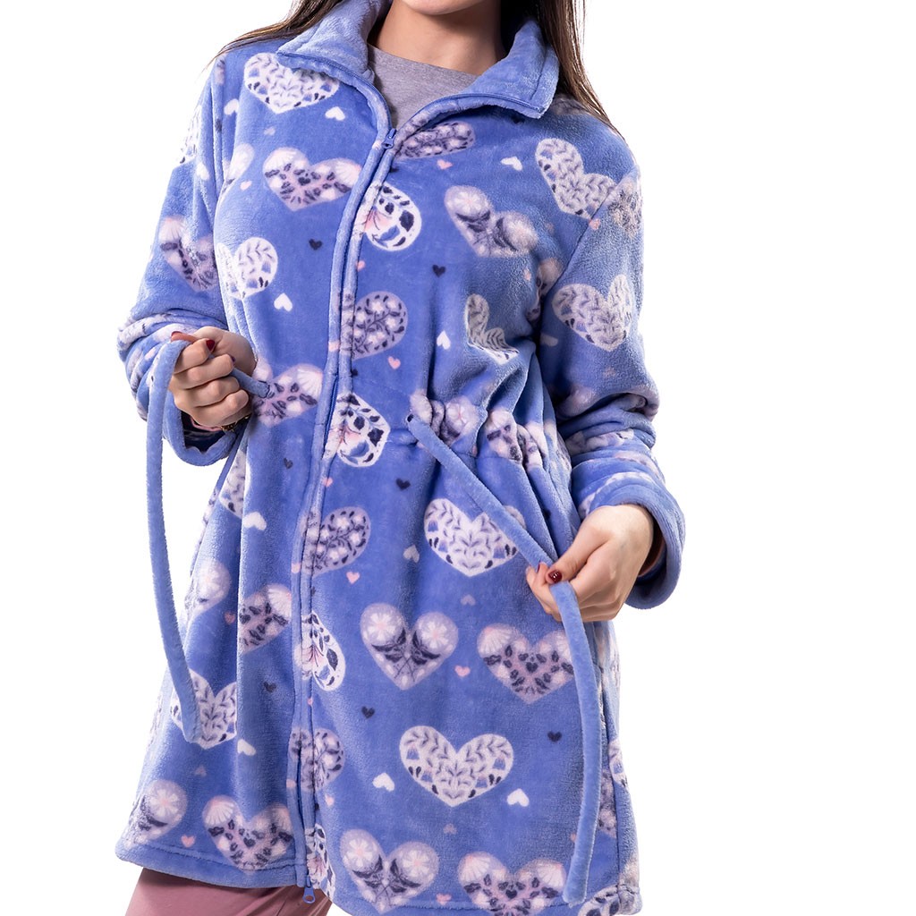 Bata de mujer con cierre de cremallera y cintura ajustable con cordón, confeccionada en tejido de coralina estampada, con bolsillos laterales. De la marca Kinanit.