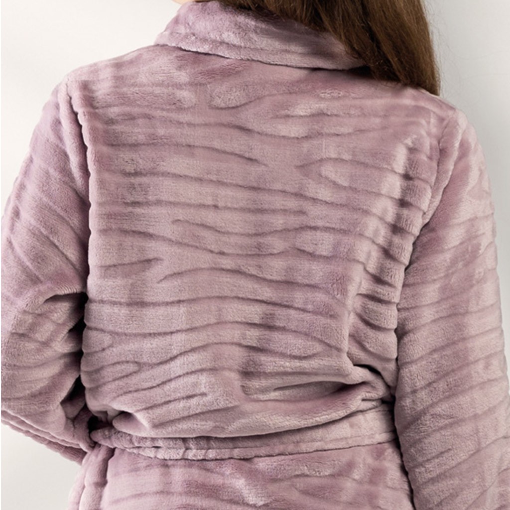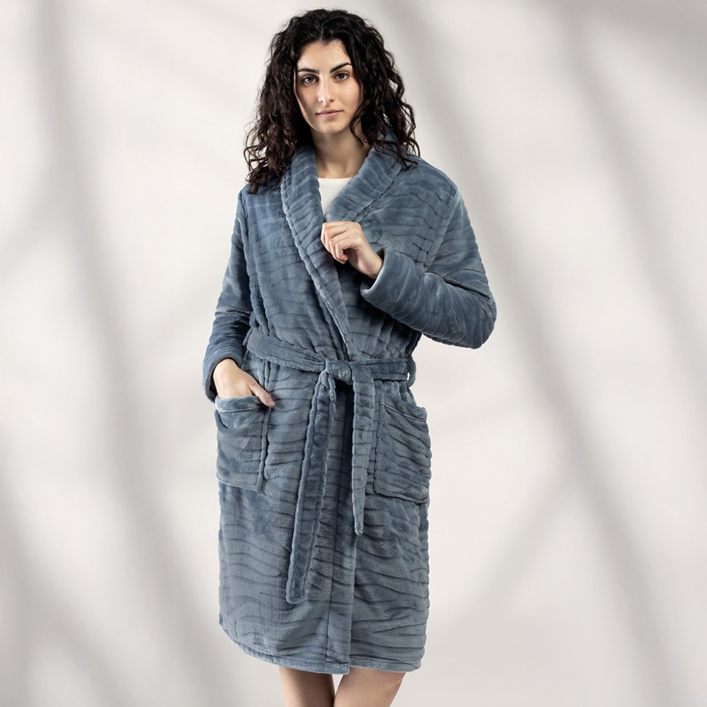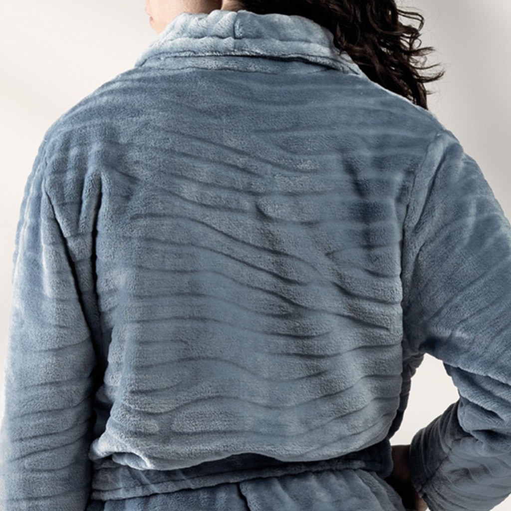 Bata larga de mujer confeccionada en tejido de coralina, cruzada con cinturón y bolsillos frontales. De la marca Lin.