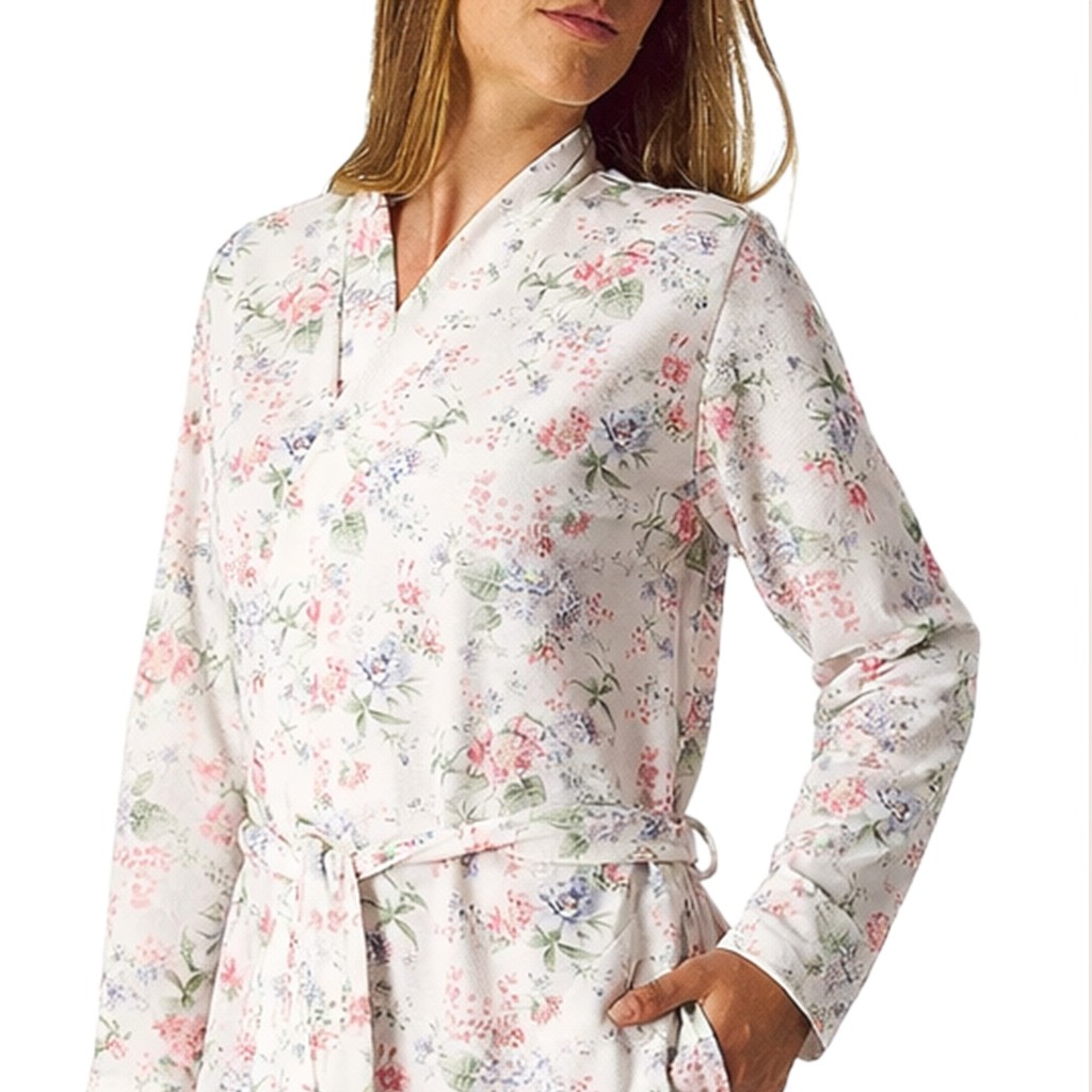 Bata de mujer abotonada con cinturón, confeccionada en tejido de algodón con estampado de florecitas y de manga larga.