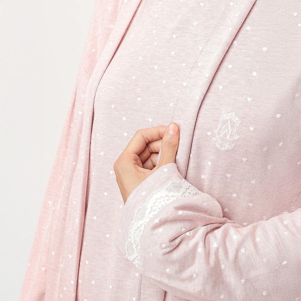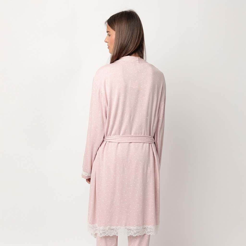 Bata de mujer confeccionada en tejido de viscosa estampado de topos, de manga larga, cruzada con cinturón y con acabados de encaje. Se envía en caja.