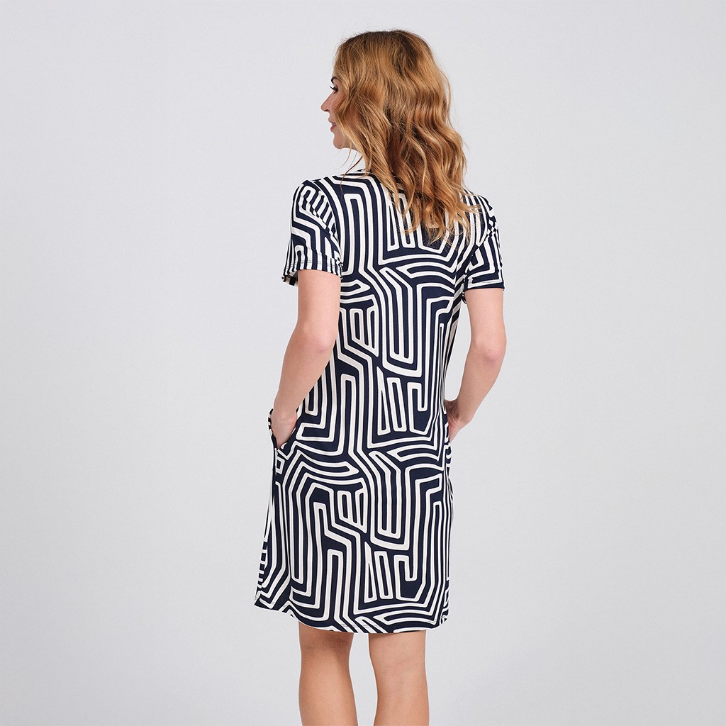Vestido de mujer para verano confeccionado en tejido ligero con estampado geométrico con relieve, abierto con botones, de manga corta y cuello redondo, con bolsillos laterales pespuntados.