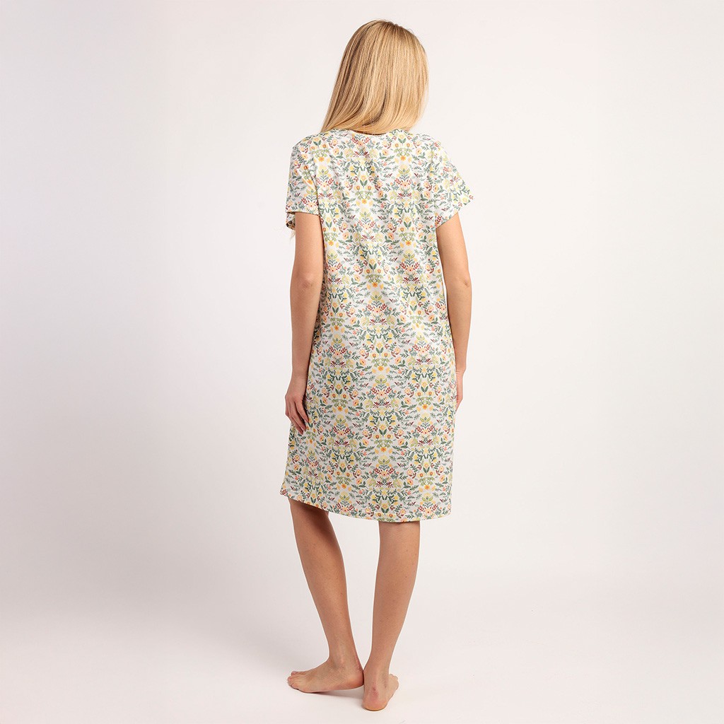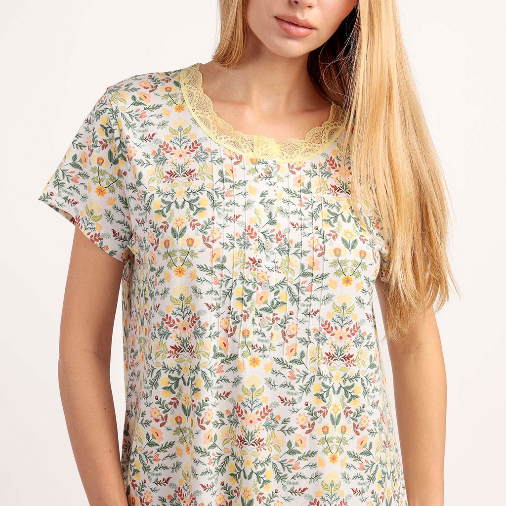 Camisón para mujer en tejido de viscosa con estampado de flores, cuello redondo con encaje y manga corta. Se envía en caja.