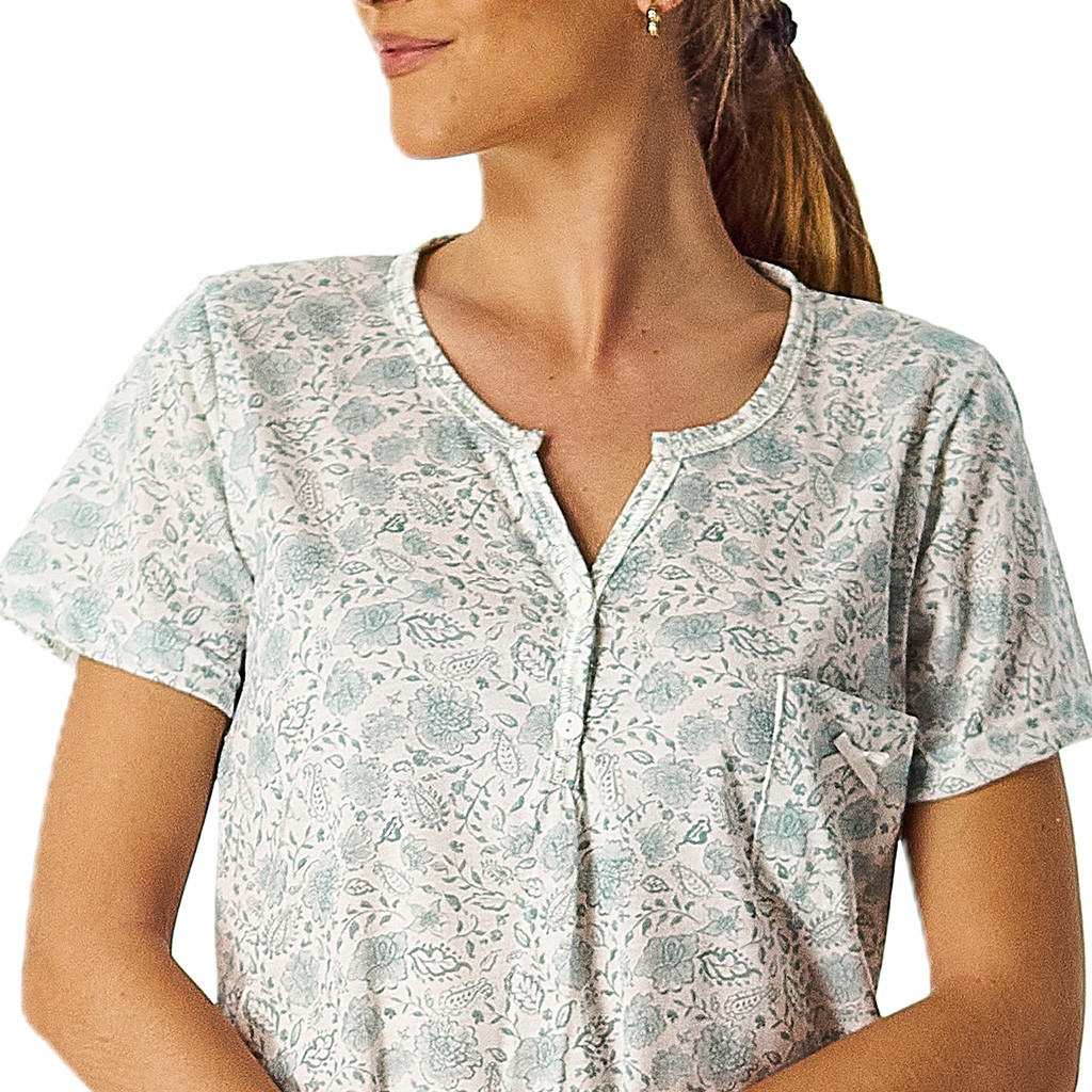 Camisón de mujer de manga corta con cuello de botones confeccionado en tejido de lgodón estampado. Presntado en caja.