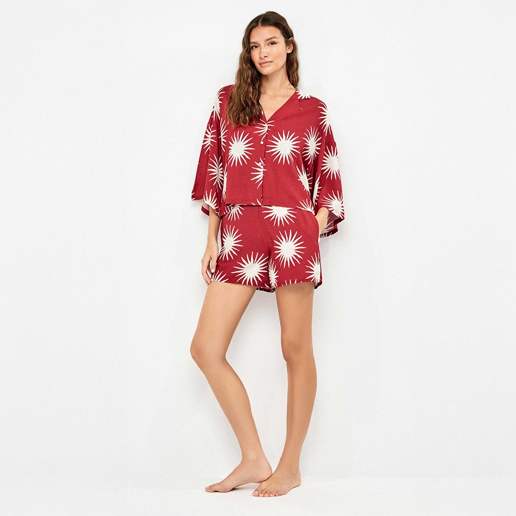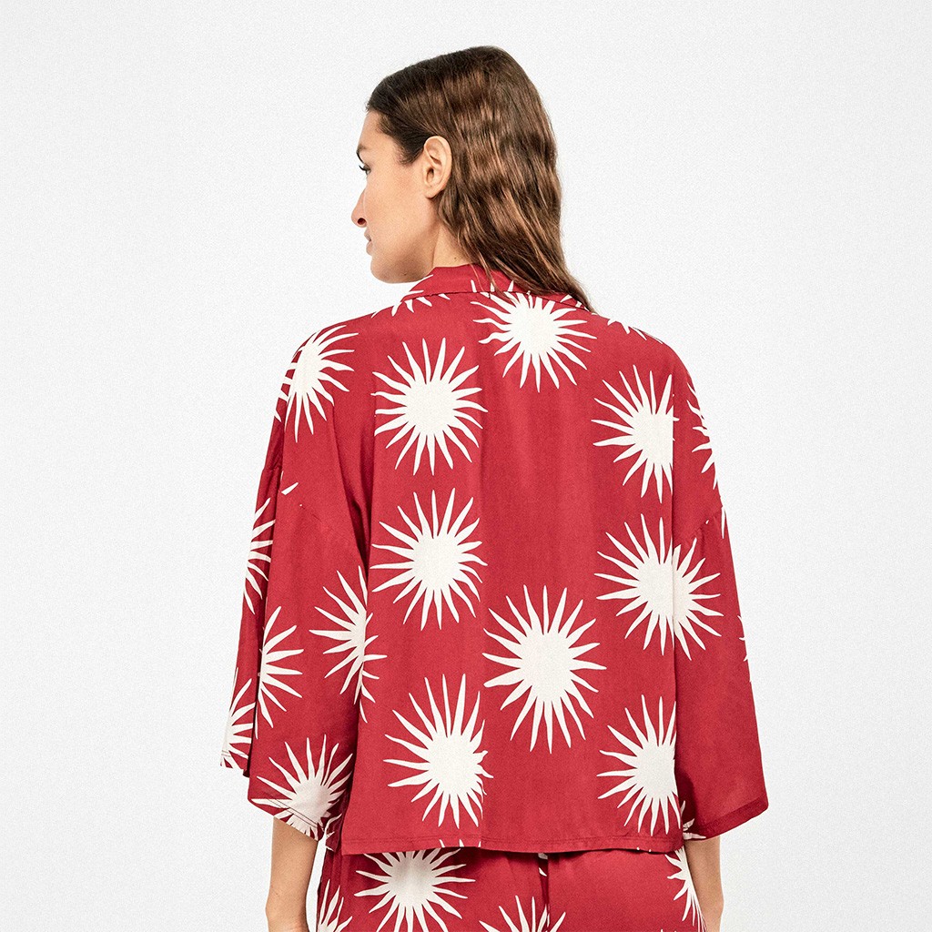 Camisa de pijama para mujer confeccionada en tejido de viscosa con estampado de soles, corta de cintura y de media manga. Ideal para combina con 2/20373 y 2/20375 de Gisela.