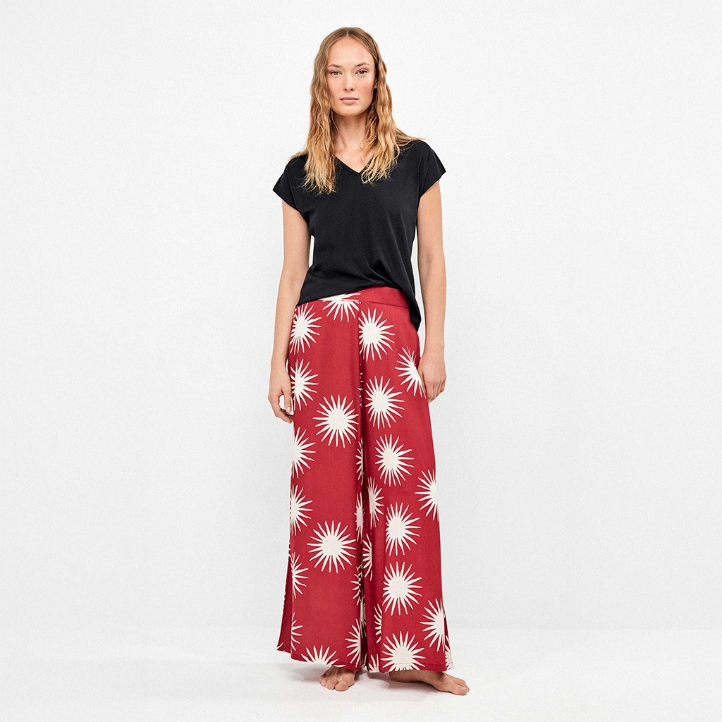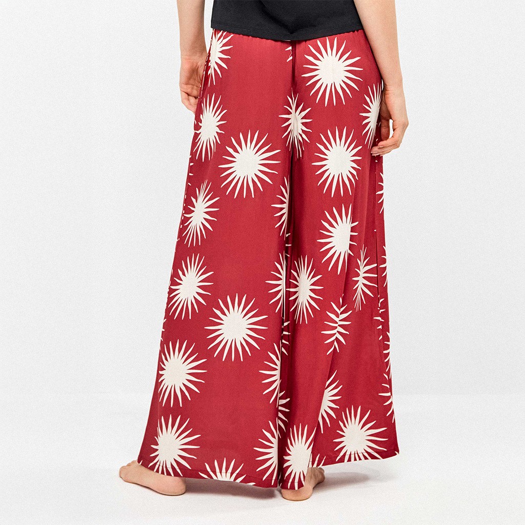 Pantalón de pijama fluido para mujer confeccionado en tejido de viscosa con estampado de soles y apertura en la parte baja. Combina con camisa 2/20372 de Gisela.