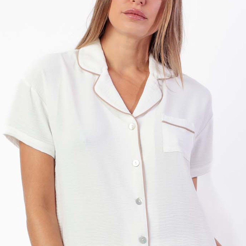Elegante pijama liso para mujer en tejido de crepé, con camiseta de manga corta con botones, cuello esmoquin y pequeño bolsillo lateral con pantalón corto. Presentado en caja.
