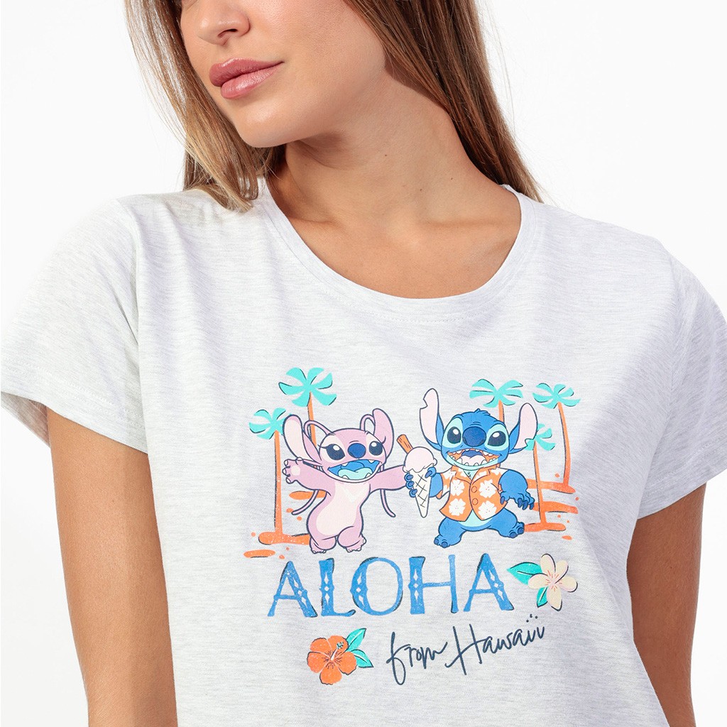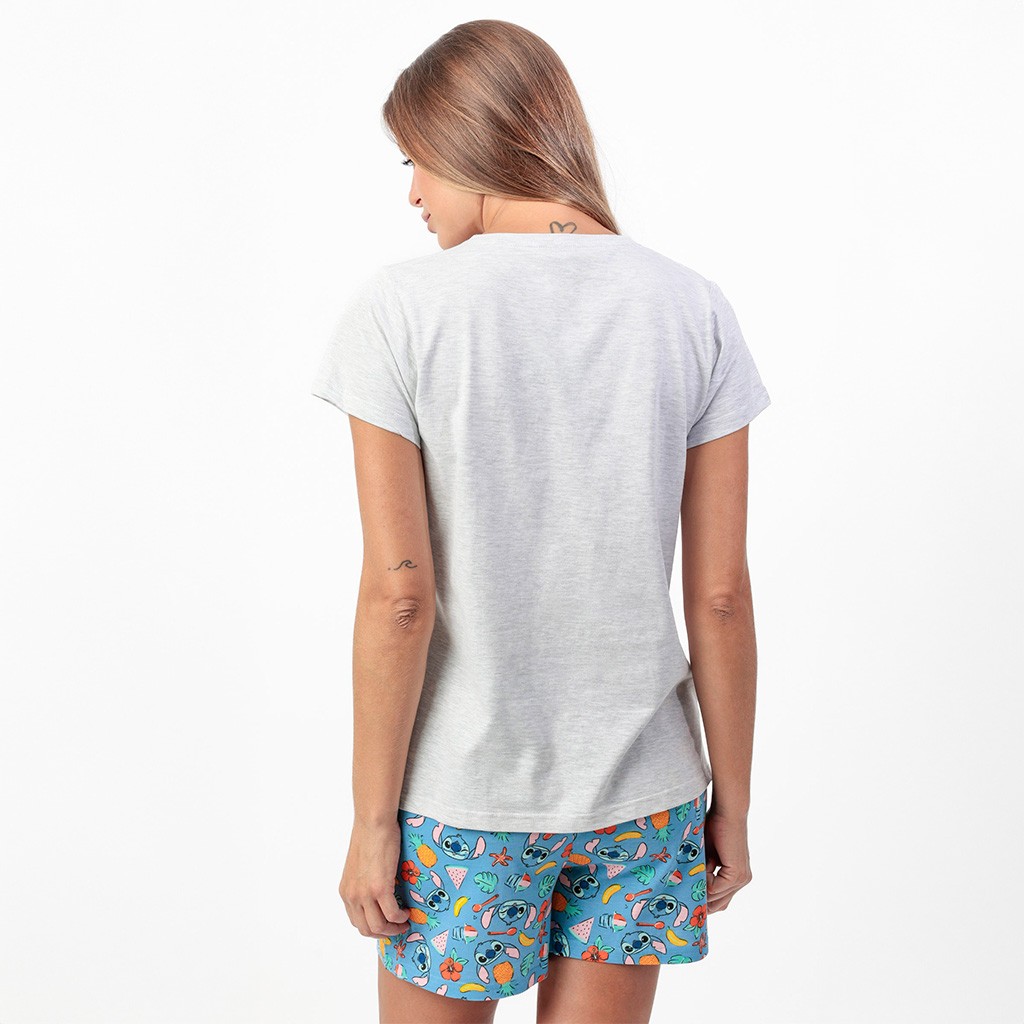 Pijama de mujer en tejido de algodón estampado con dibujos de Stich compuesto por camiseta de manga corta y pantalón corto. Presentado en cajita.